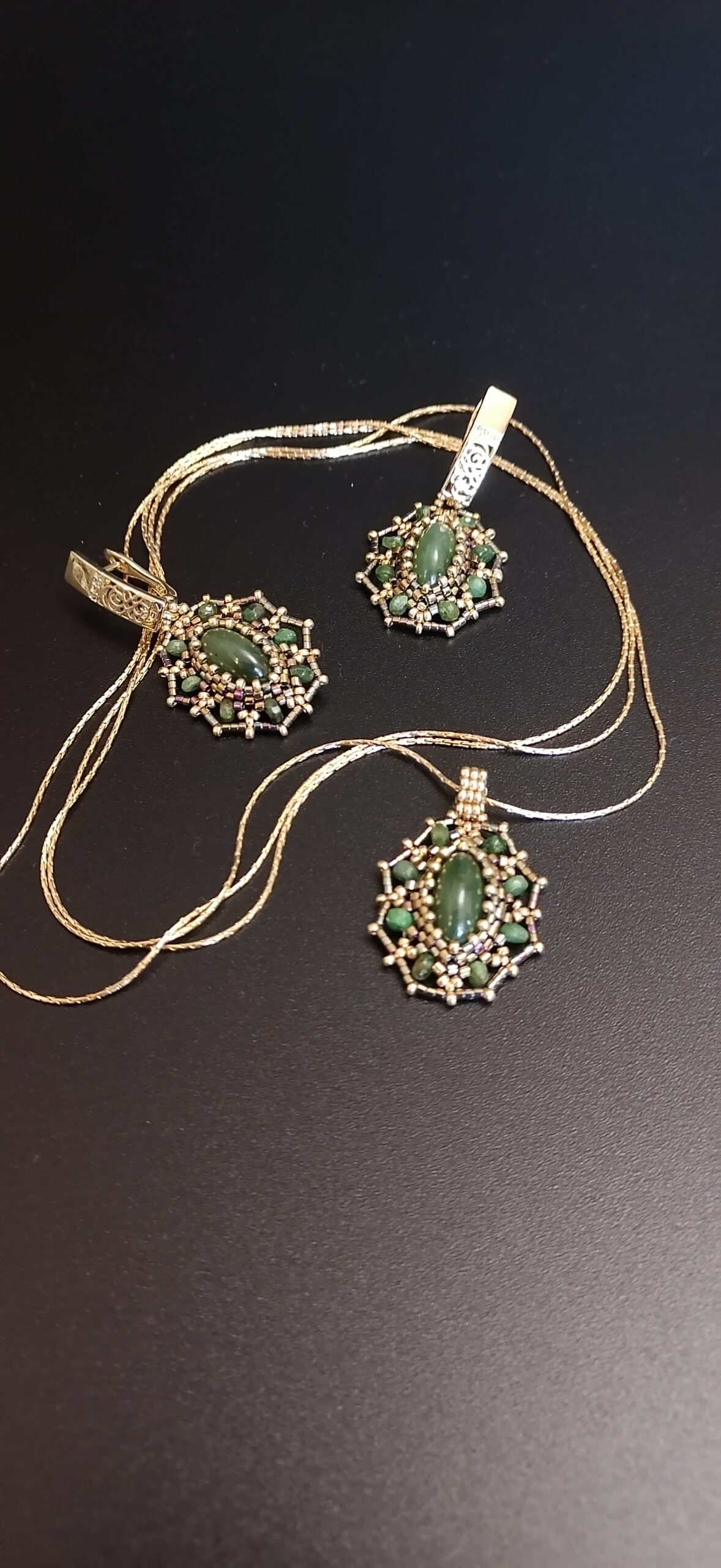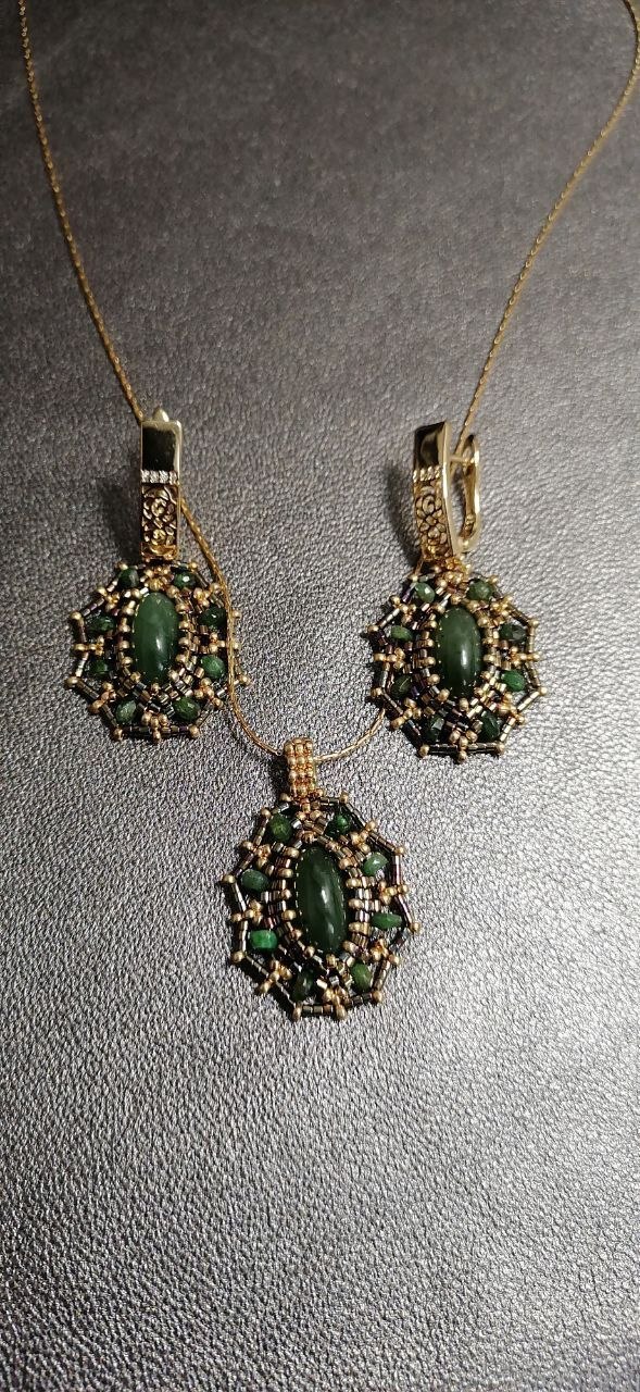 Ручная работа. Симфония природной красоты и ювелирного мастерства. Кабошон нефрита оплетен позолоченным японским бисером. Глядя на эти украшения вы никогда не подумаете что они сплетены вручную, выглядит как золотое ювелирное украшение! Натуральный, чистый, красивейший нефрит в обрамлении зеленых бериллов (изумрудов). Фурнитура с золочением.