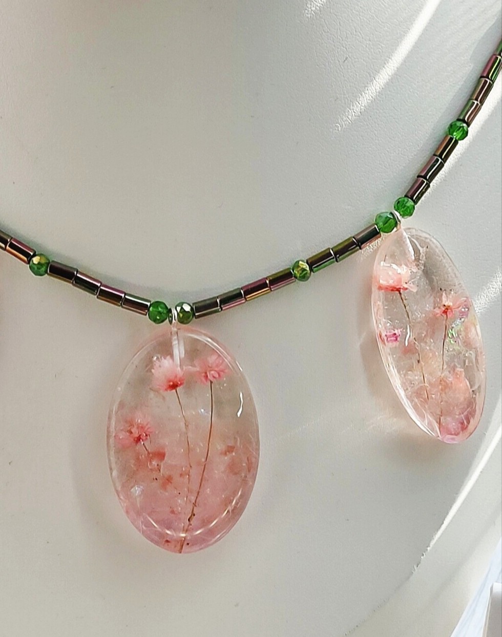 - Гармония деталей: колье дополнено бусинами из гематита и хрустального стекла, которые гармонично сочетаются с цветочными элементами.