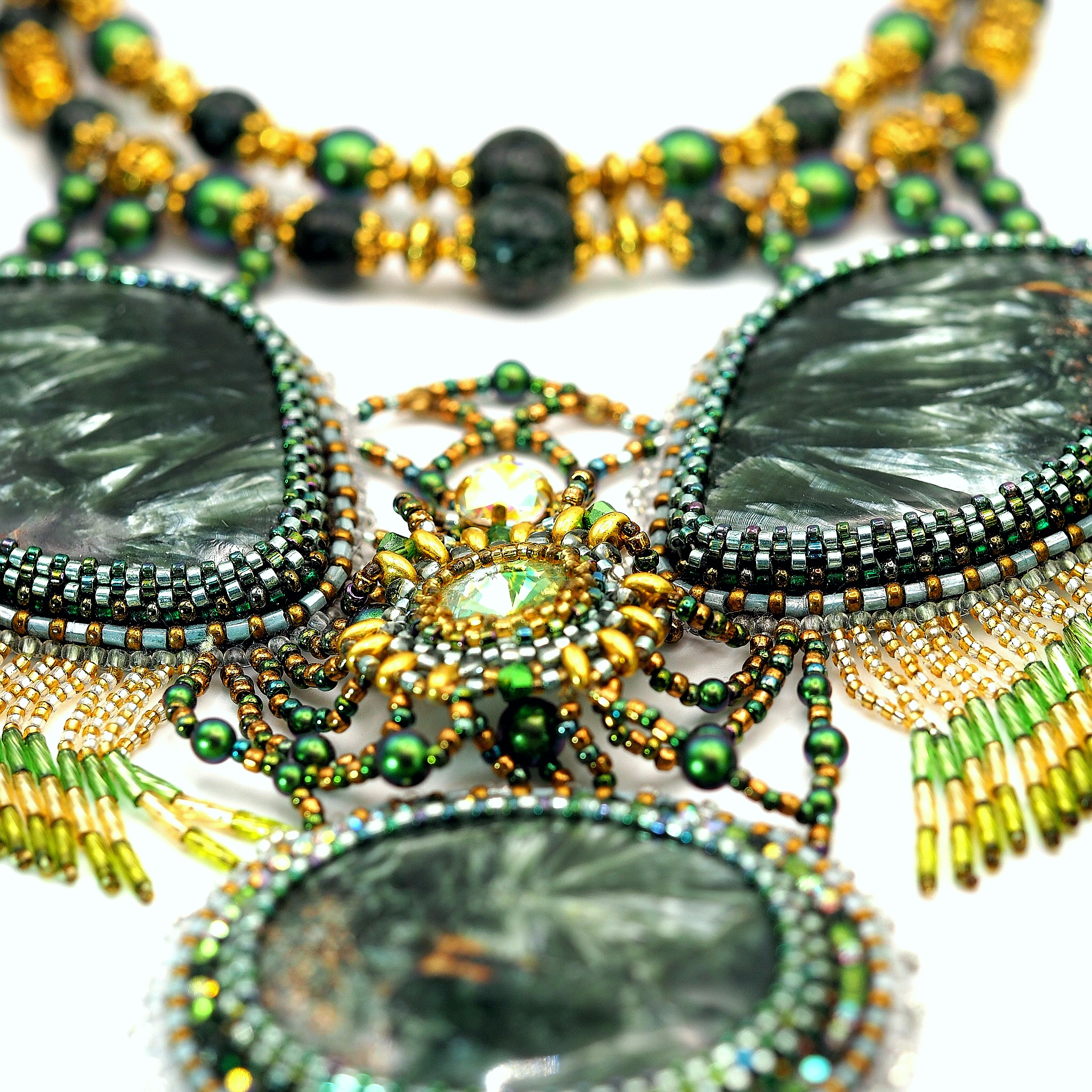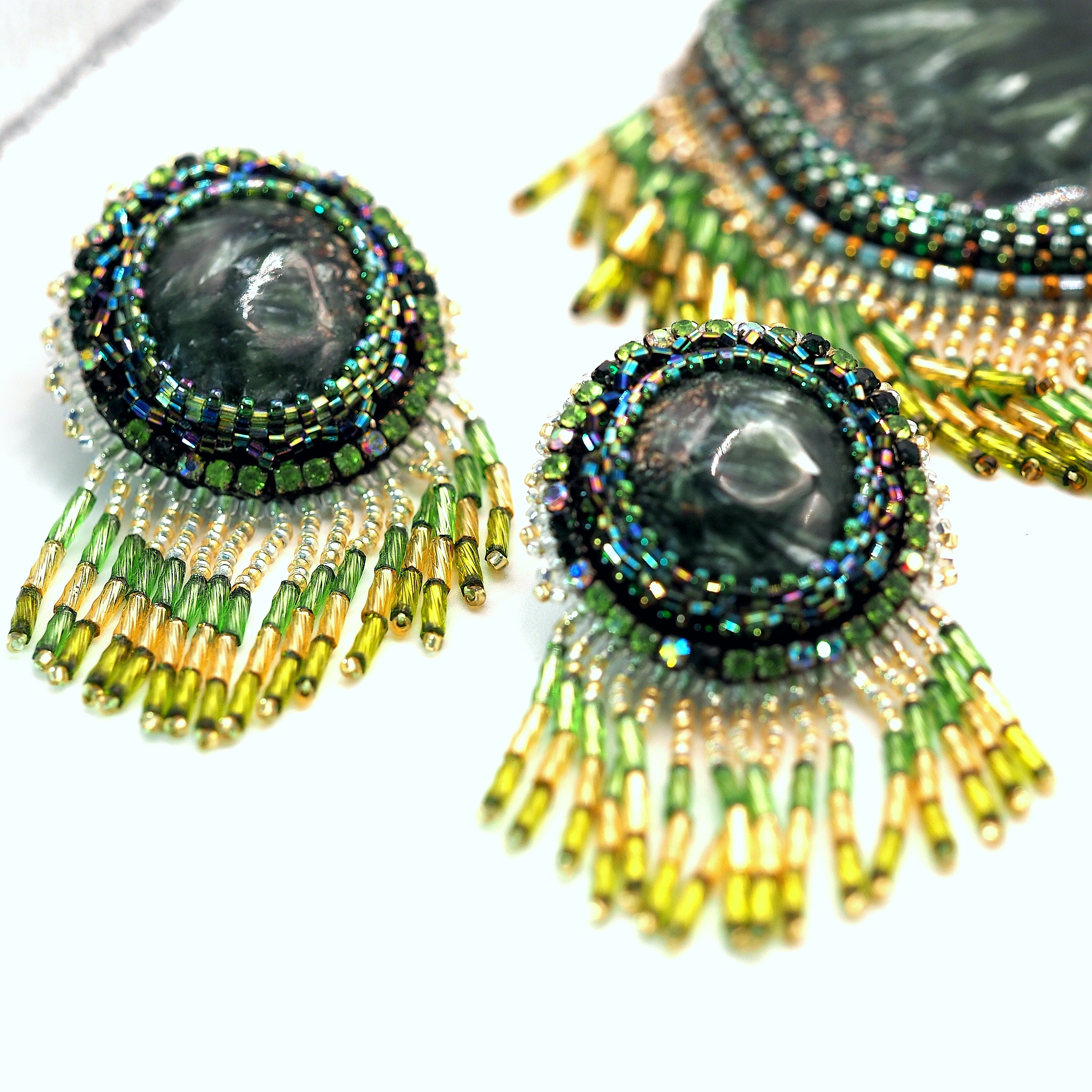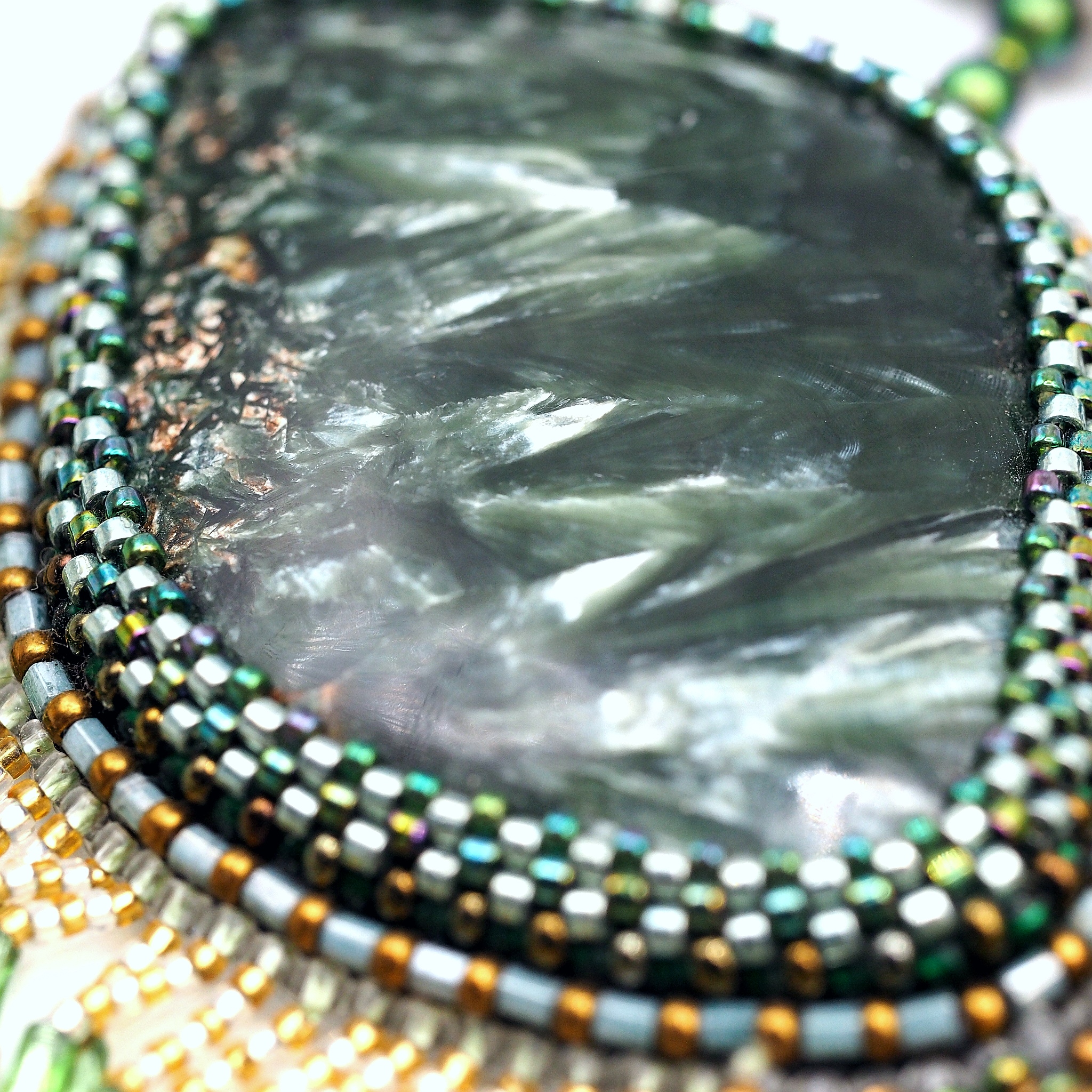 — центральный элемент — кабошон из серафинита, обрамлённый вышивкой из бисера;