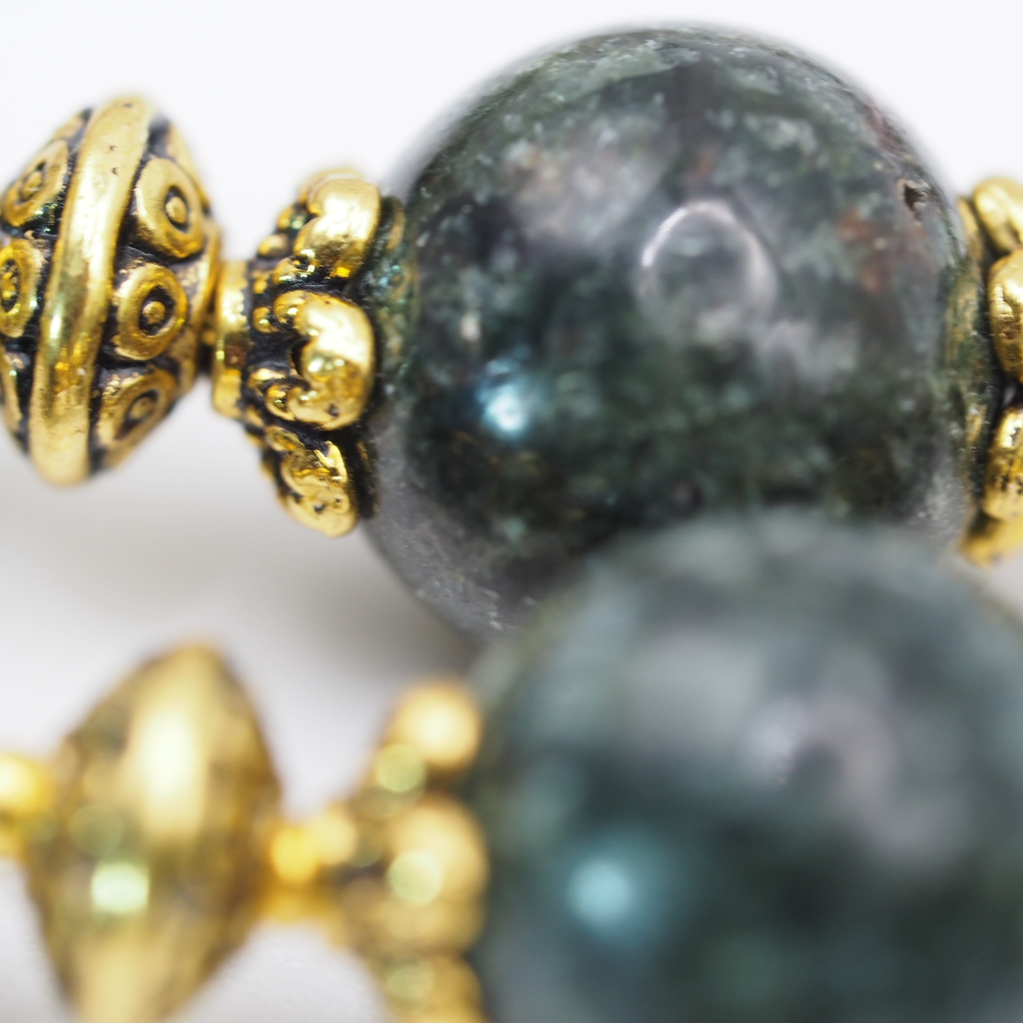 -выполнено с использованием крупных кабошонов из серафинита — камня с характерным серо-зелёным оттенком и мерцающими включениями;