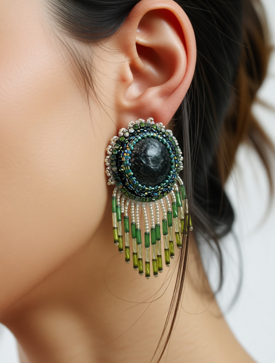 -кабошоны обрамлены вышивкой из бисера, создающей изысканный контур вокруг каждого камня;