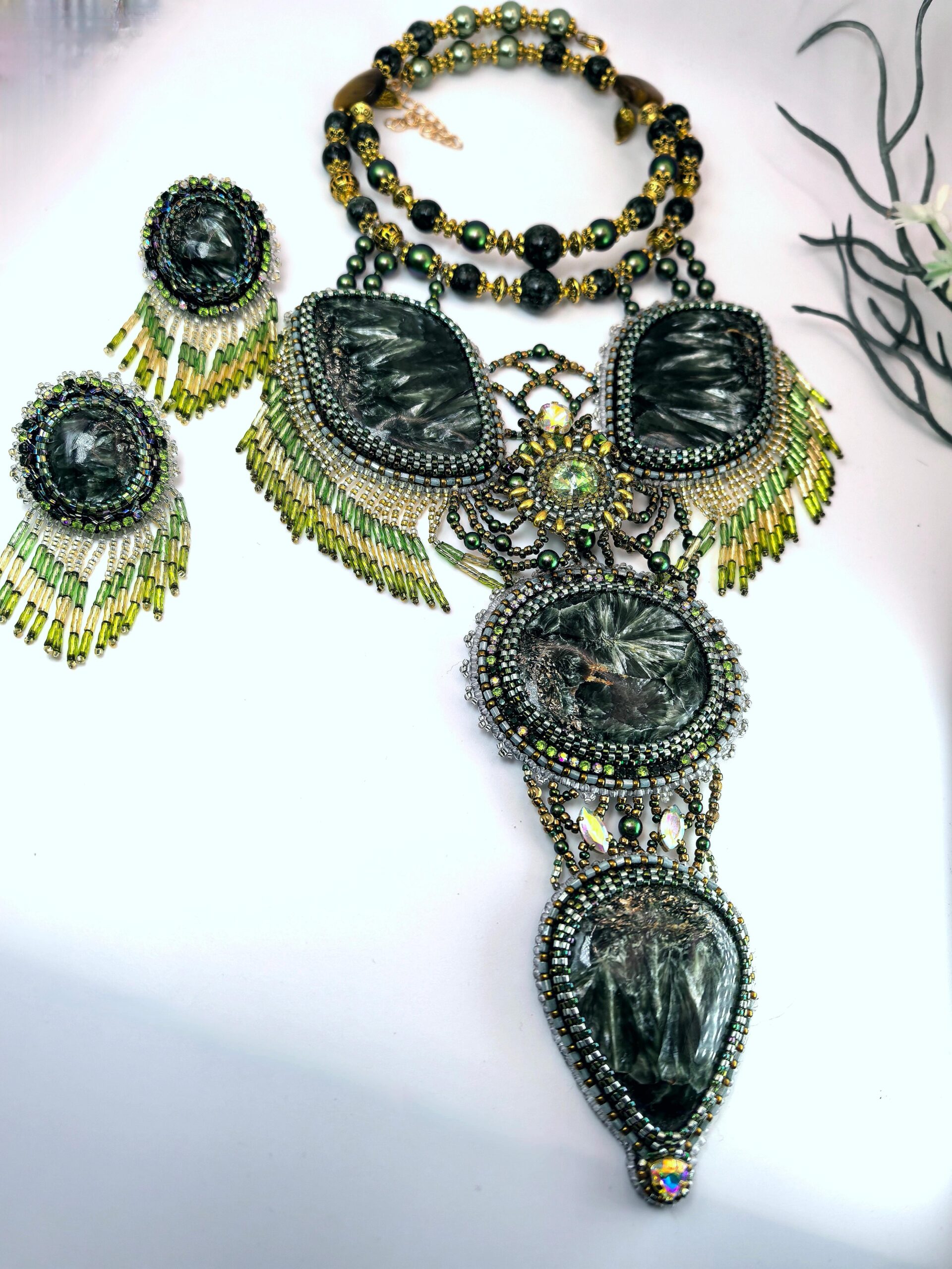 На изображении представлен комплект украшений ручной работы с серафинитом, состоящий из колье и серёг.