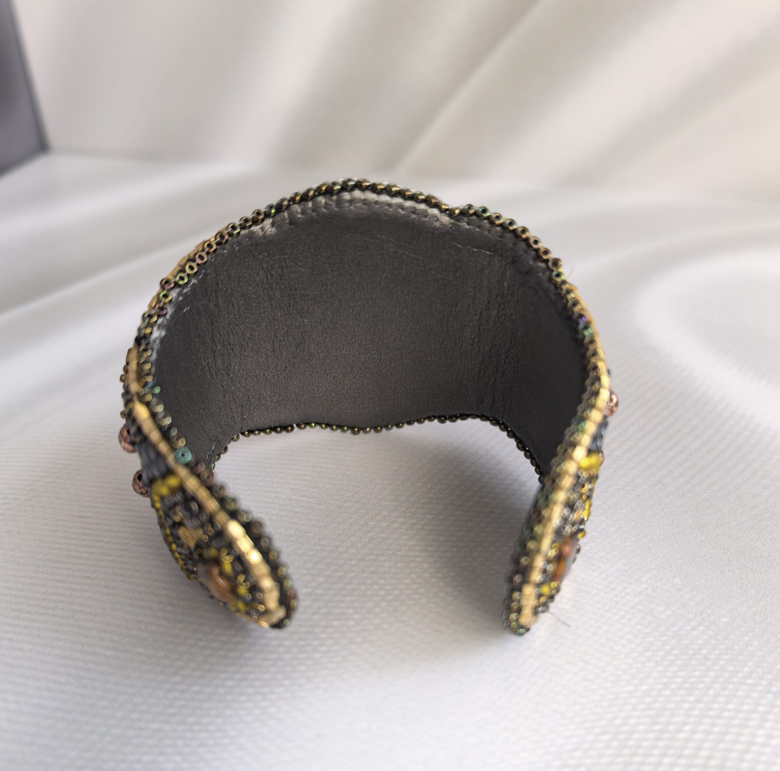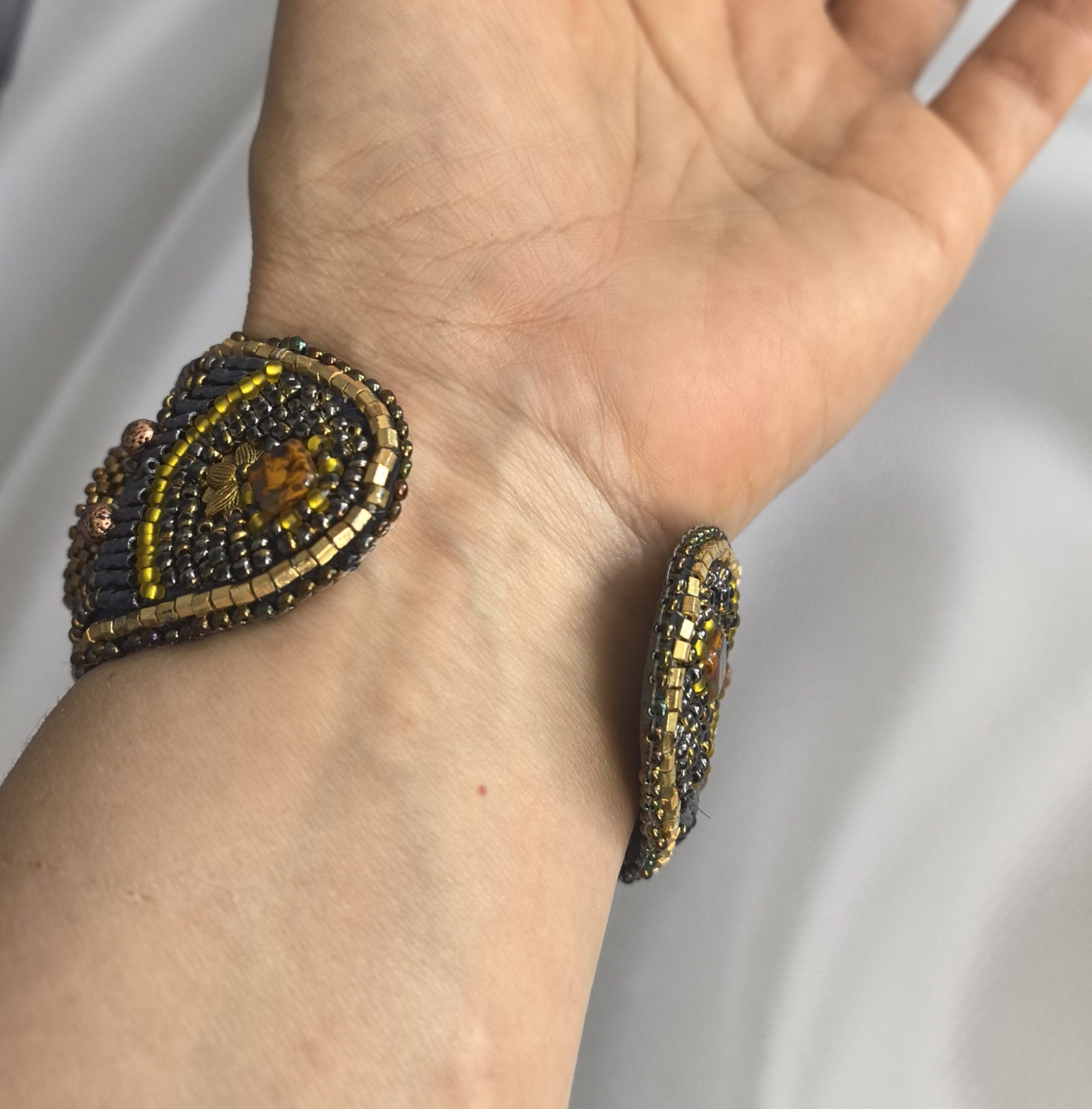 Центральный элемент — из океанической яшмы, обрамлённая вышивкой из бисера.