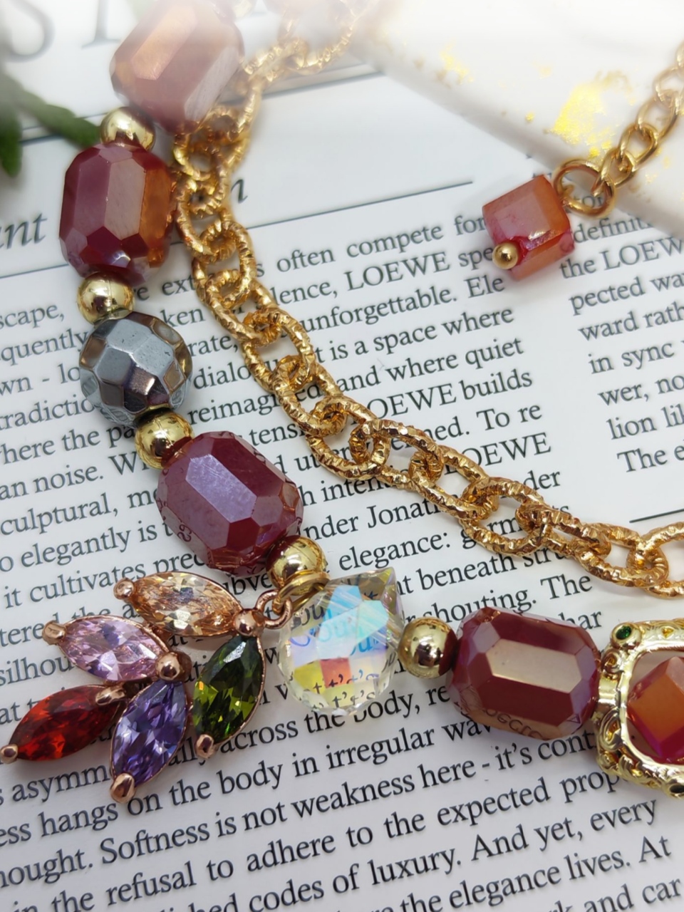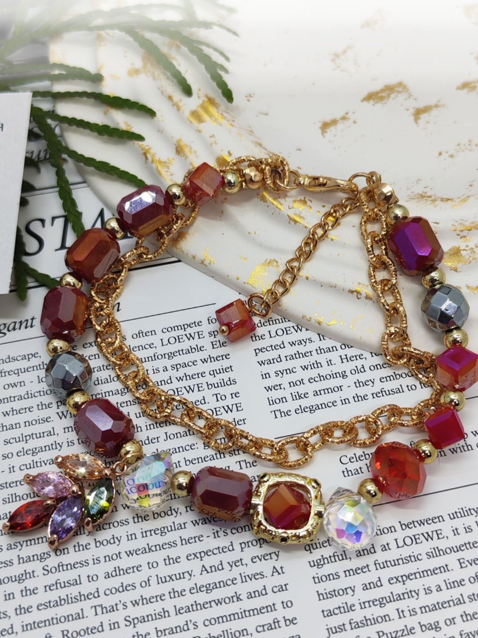 · Браслет: многослойная композиция из золотистых цепочек, украшенная крупными гранёными бусинами насыщенных оттенков — от глубокого бордового до ярко-красного. Центральные элементы дополнены изящными подвесками в виде разноцветных «лепестков» с цирконами фиолетового, зелёного, розового и желтого цвета, которые придают украшению особую динамику.