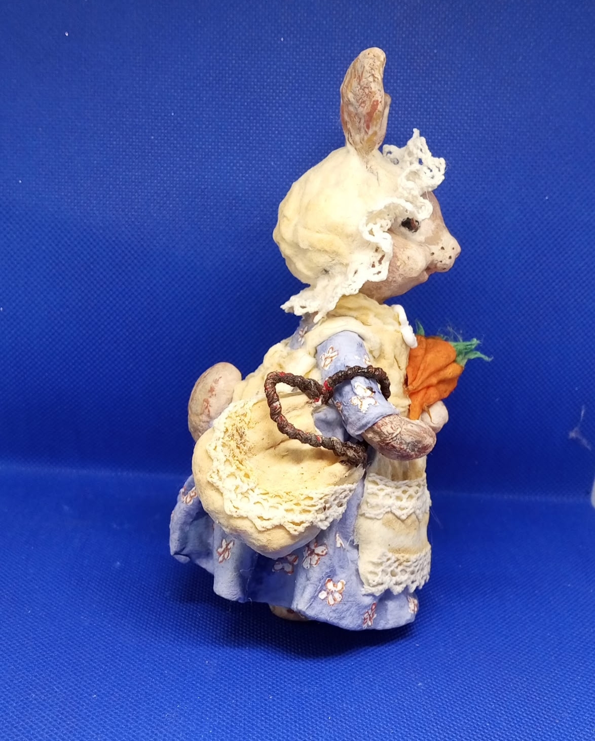 Крольчиха из хлопковой и льняной ваты. Роспись акриловыми красками. Фартук, чепчик и сумка украшены хлопковым кружевом. Может использоваться, как ёлочная игрушка (по желанию покупателя сделаю подвес) и как интерьерное украшение (прекрасно стоит без опоры). Будет уместна, как пасхальный сувенир или памятный подарок на другой праздник.