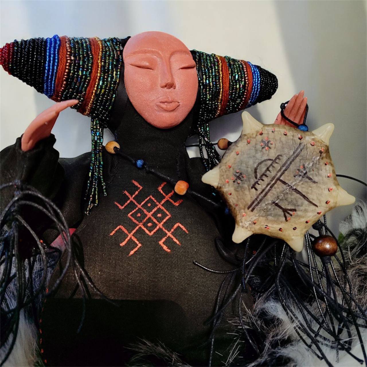 Алтайская шаманка украшена японским бисером, в её руках бубен из настоящей рыбьей кожи. Шаманка бьёт в бубен и погружается в транс, она просит духов о благополучии в пути и защищает ваш сон. Посадите ее ближе к огню чтобы магия работала.