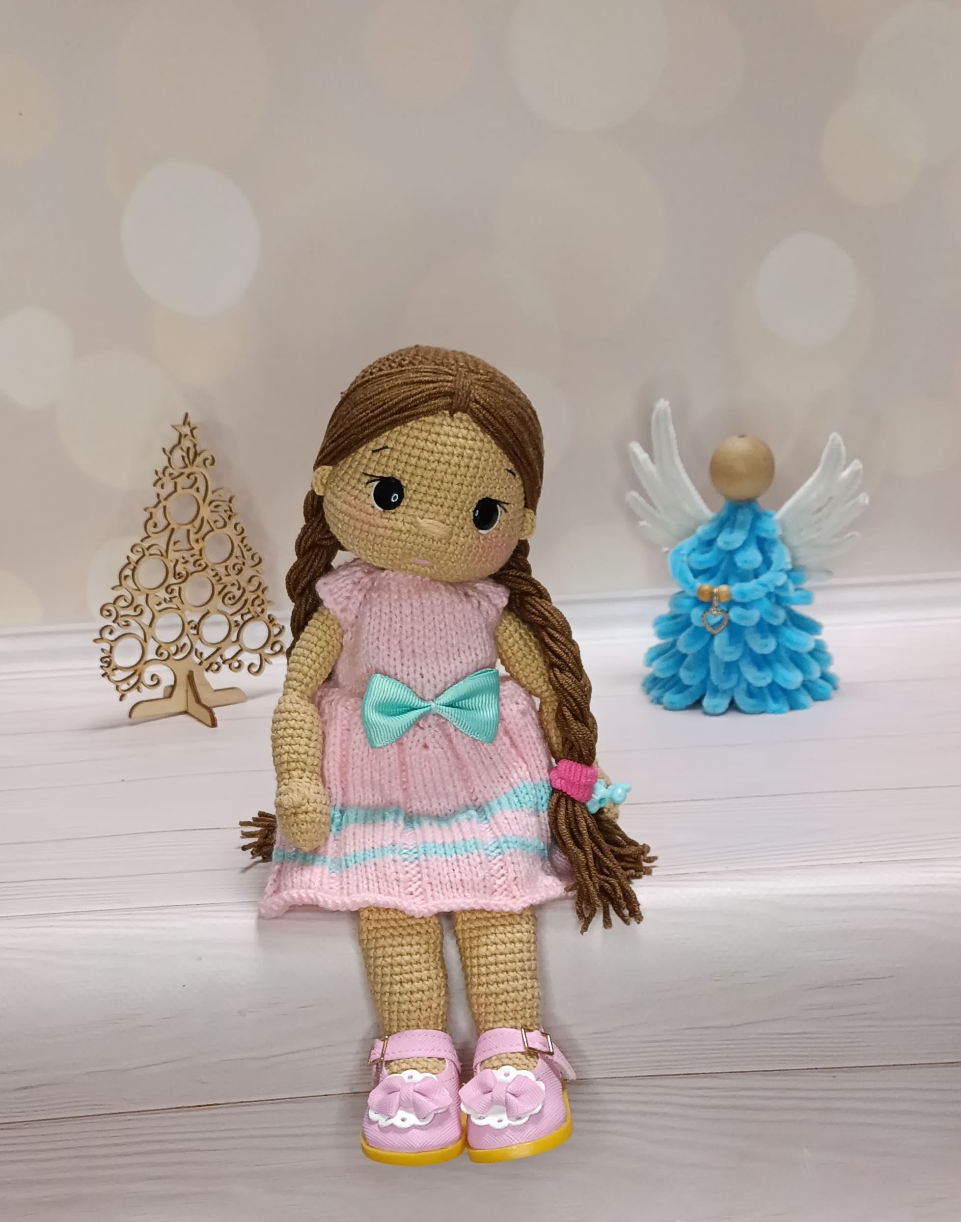 вязаная кукла в розовом платье, кукла крючком с бантом,