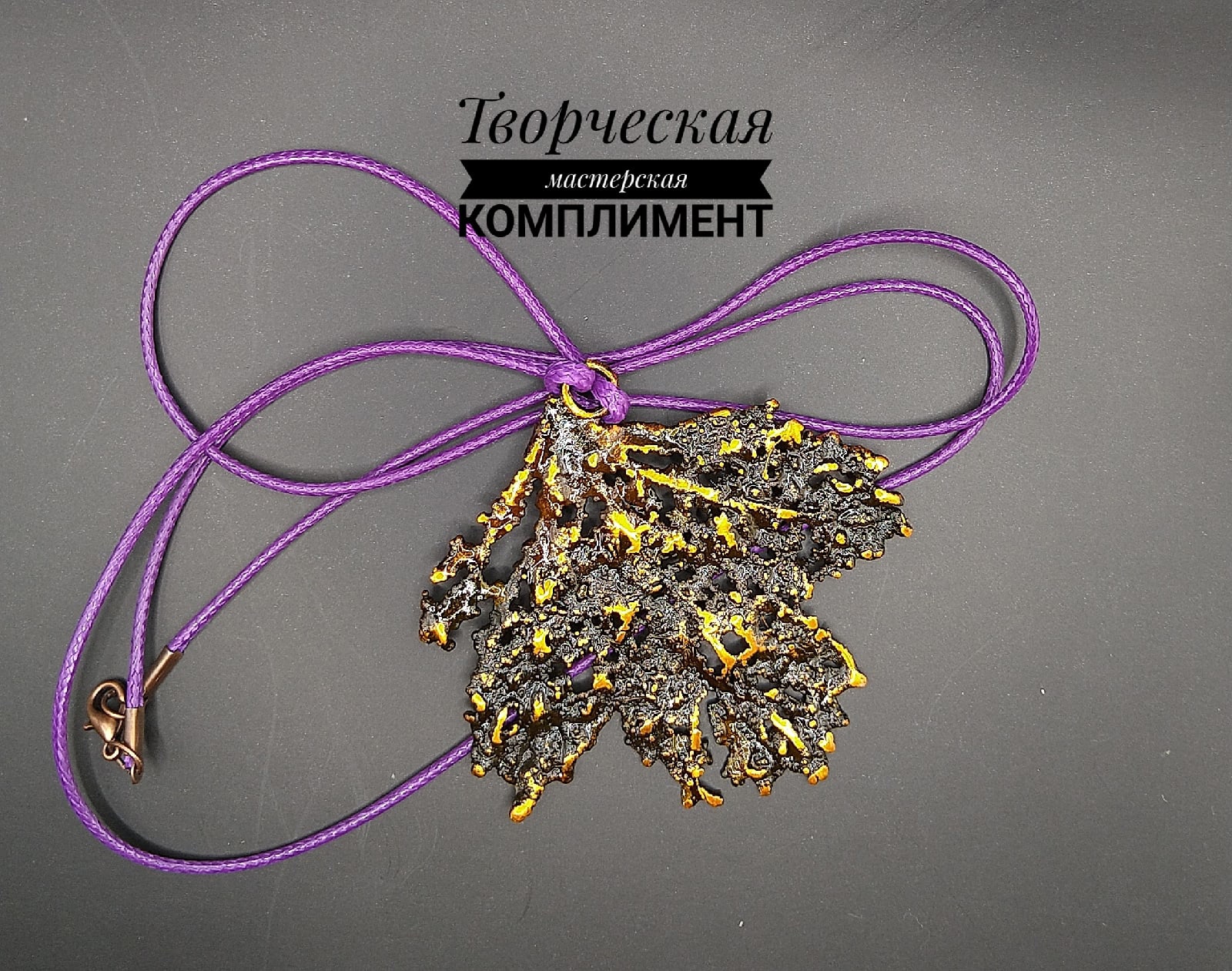 Кулон из листочка калины. Двухсторонний, ажурный, покрыт витражной краской. Шнур капроновый