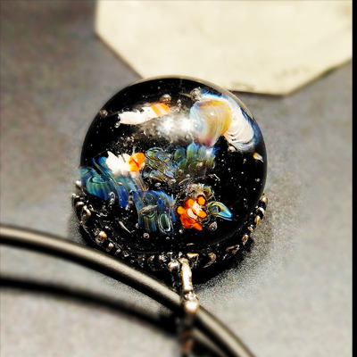 Создаю не просто украшения или декор — создаю Миры. Сегодня это подводный Мир —  кулон выполнен в морской темтике,  еще одна моя большая любовь, выплавлен мной в технике Лэмпворк. Это полностью ручная работа в огне 1200 С из муранского и серебро содержащего американского стекла. Я создаю персонажи тоже из стекла, в этом кулоне это рыбки, полипы, медузка, и помещаю горячее стекло в расплавленное. Это мурини или мелифиори.