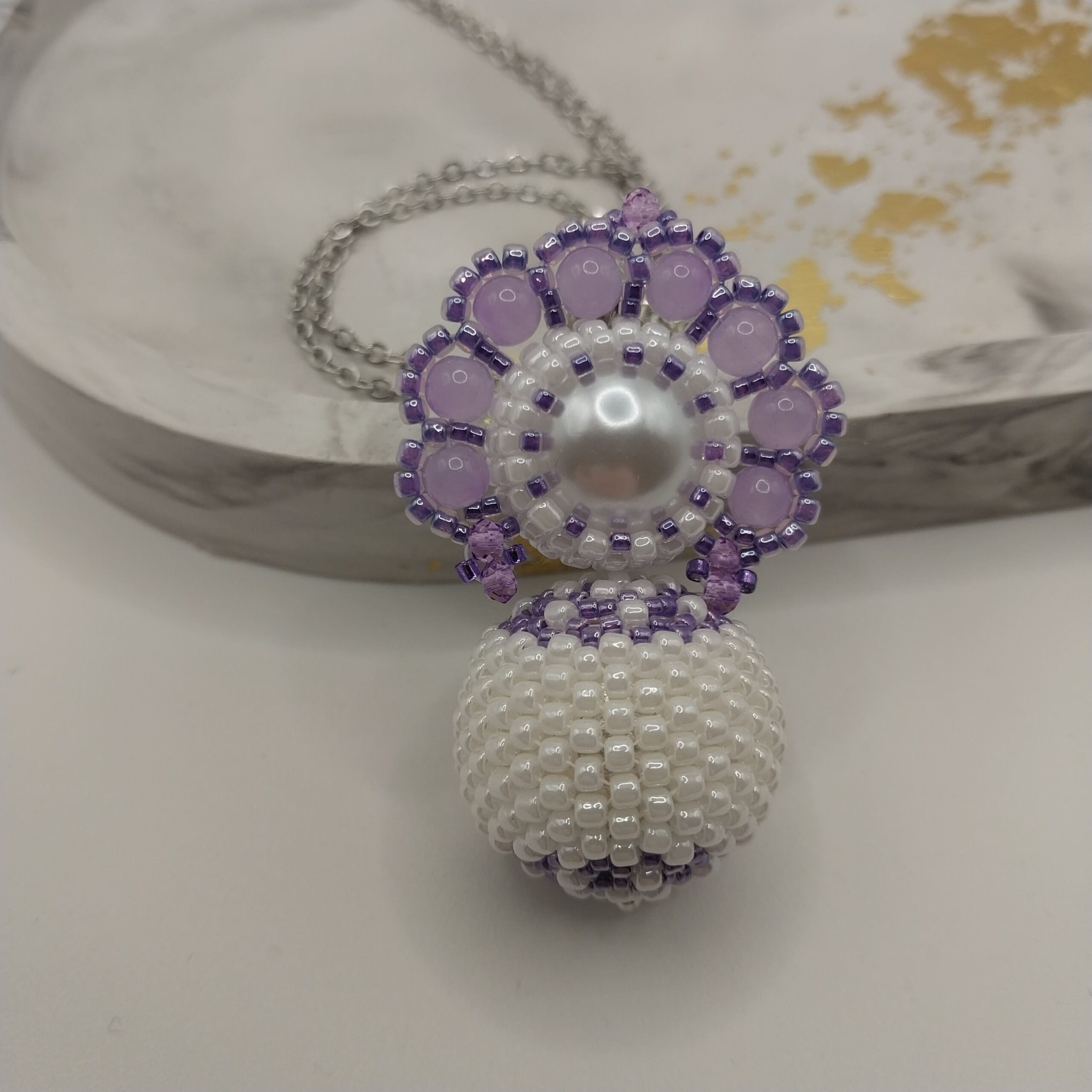 Кулон выполнен из японскогот бисера, жемчуга майорка и хрустальных бусин. В основе акриловые бусины, хлопковый жемчуг и жемчуг майорка. Крепятся на цепочку 50 см плюс удлиннитель. Фурнитура класса люкс с покрытием золота и родия.