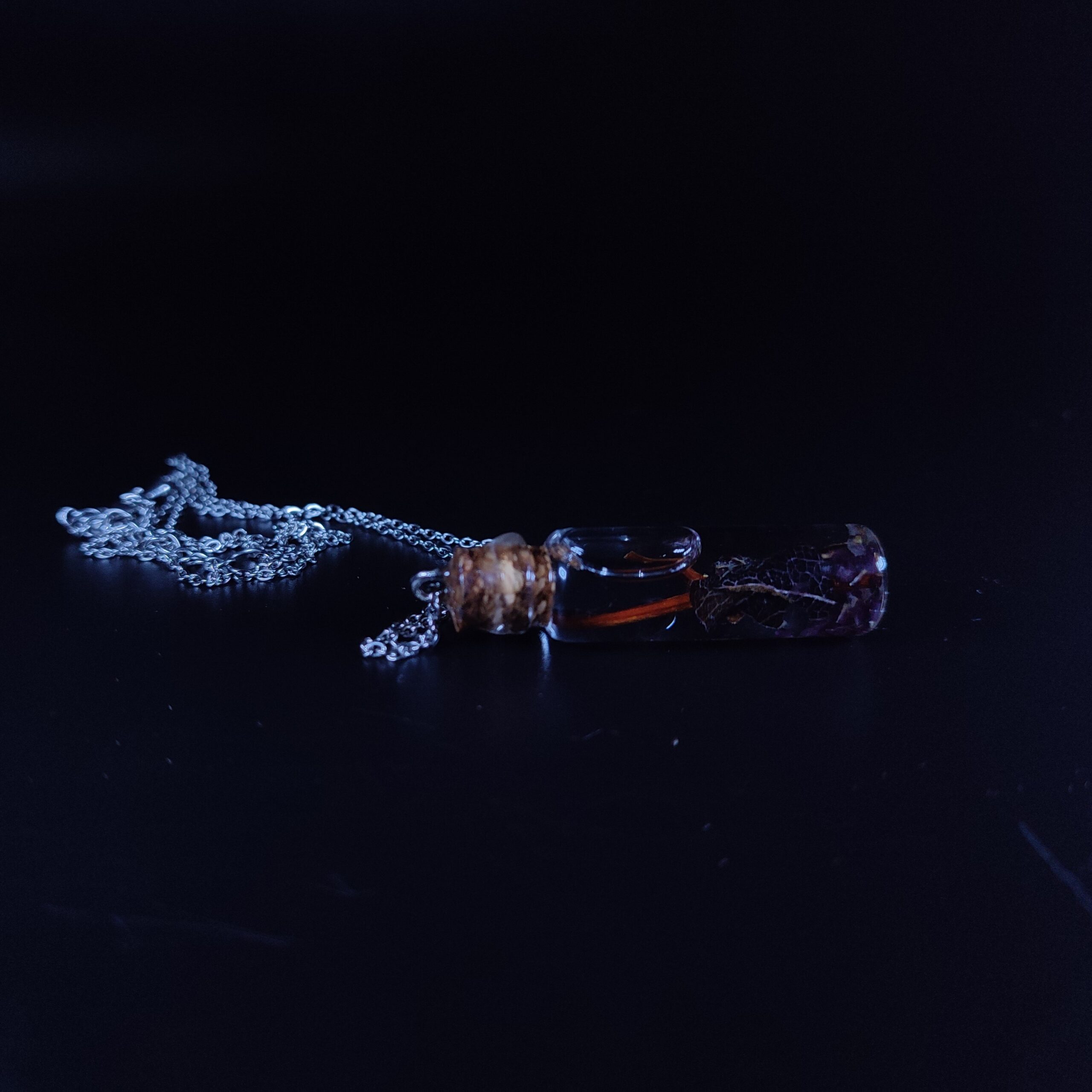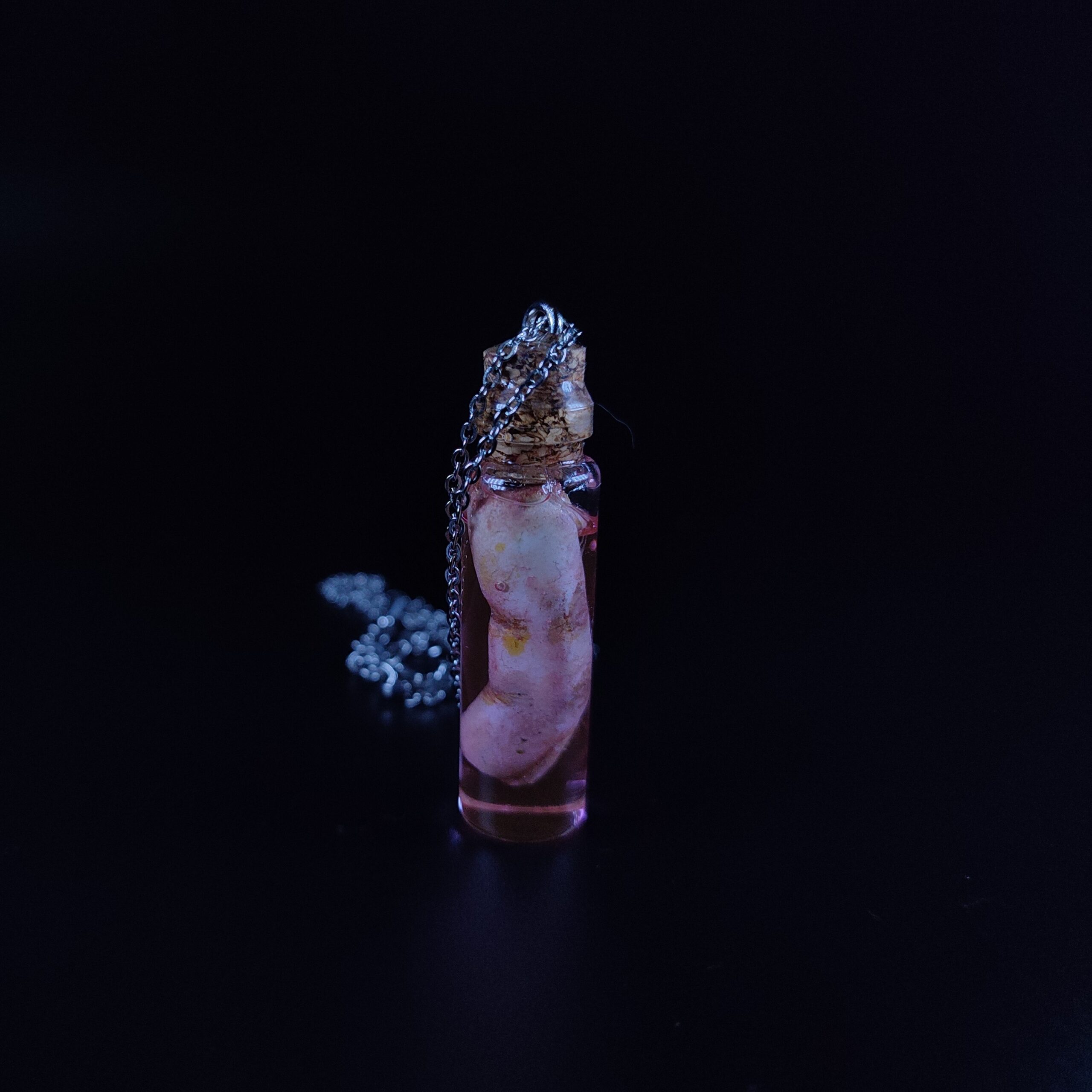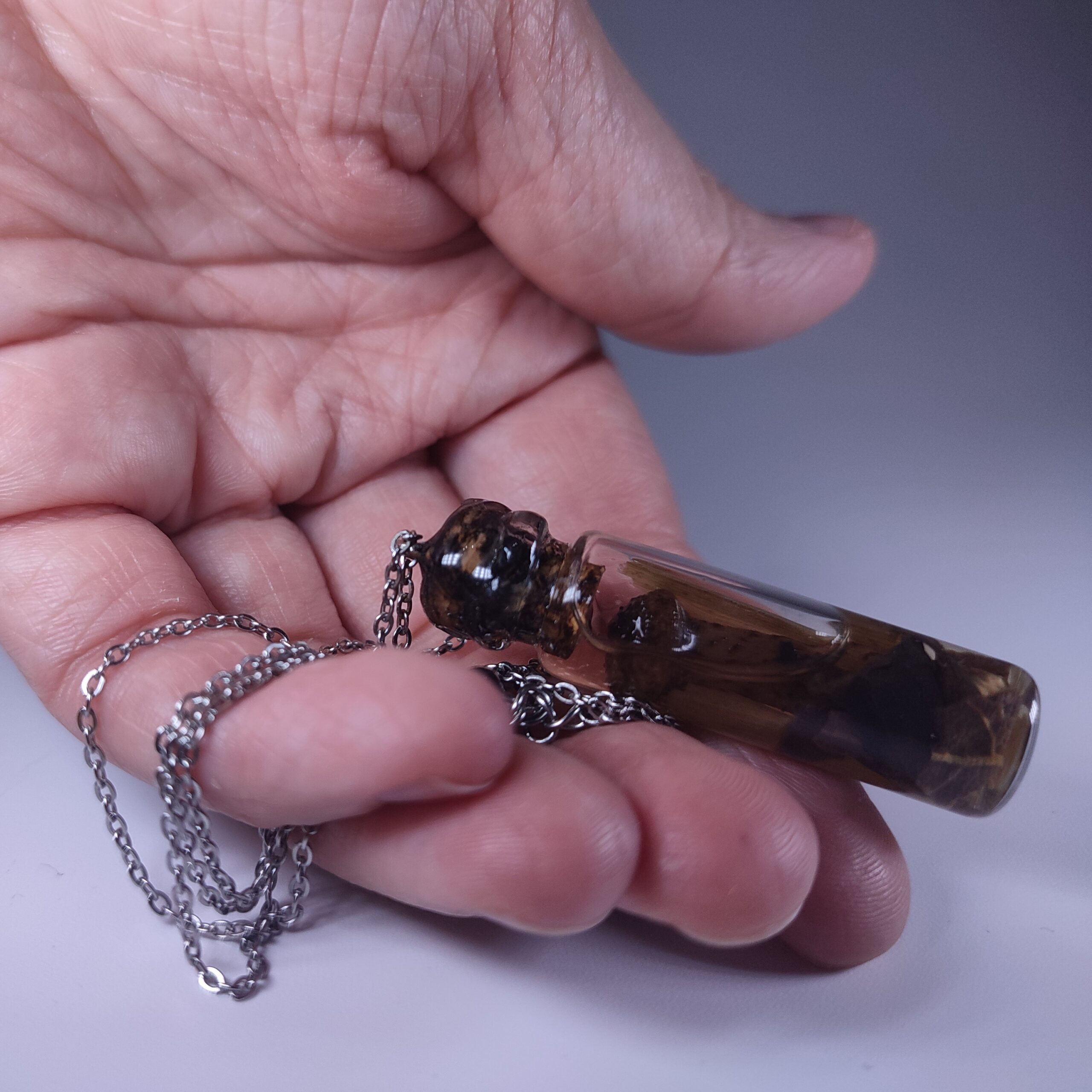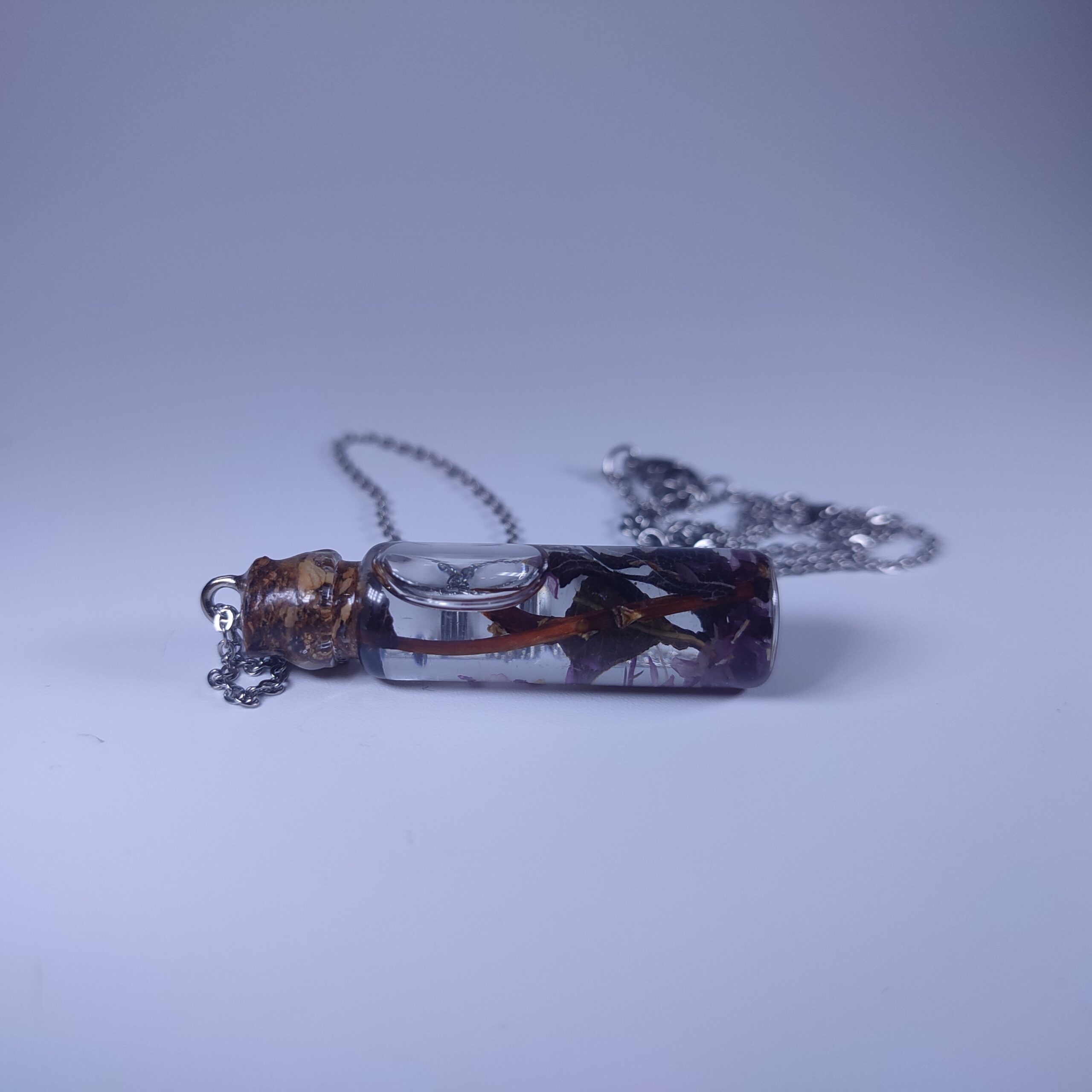 кулоны ручной работы в ассортименте — склянки с различным содержимым от цветов до глаз.