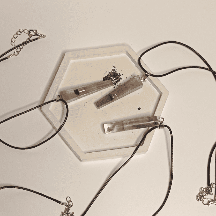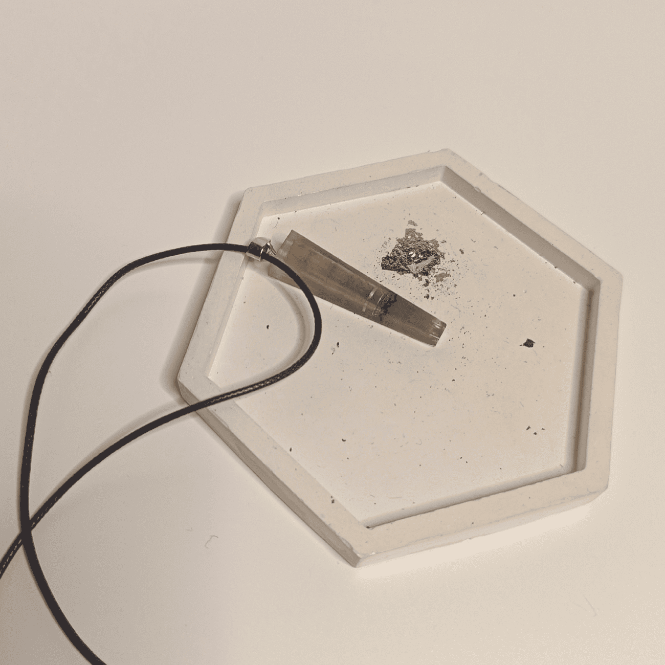 Представляем вам необычный кулон, который сочетает в себе минимализм и дерзкий шарм. Изделие выполнено в виде удлинённого прозрачного кристалла, внутри которого заключён миниатюрный окурок — словно застывший фрагмент повседневности, превращённый в произведение искусства.
