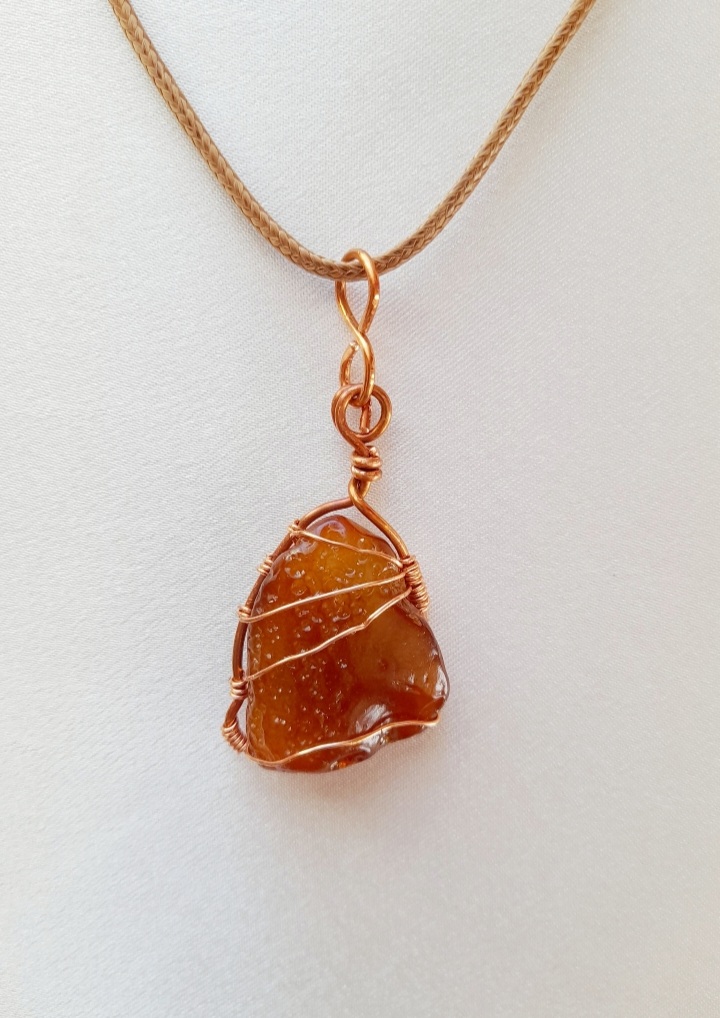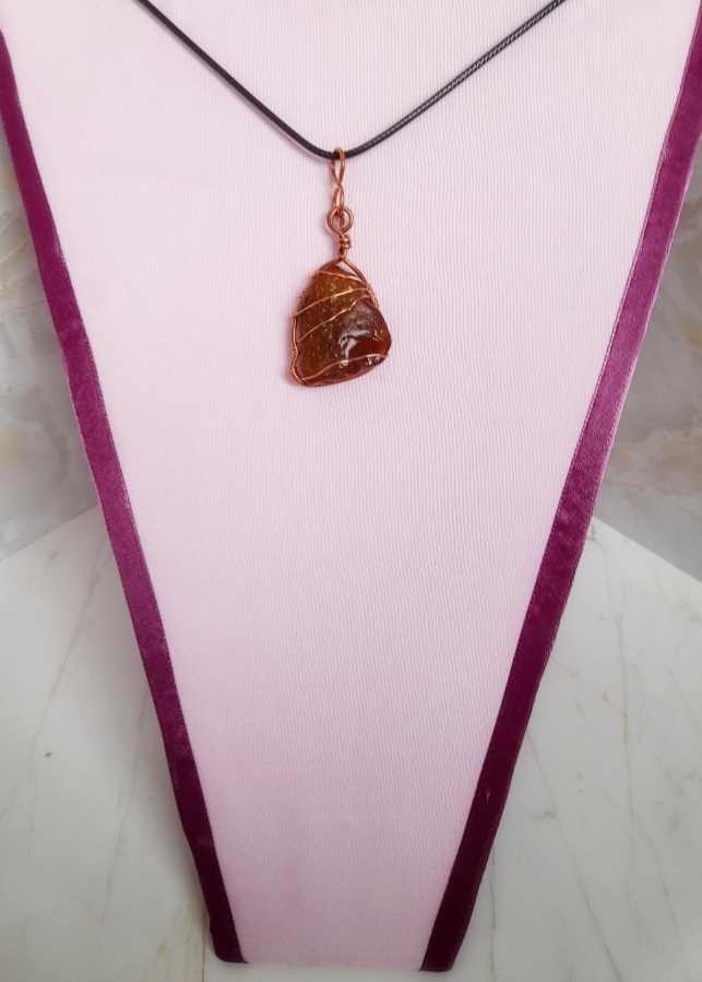 Кулон с сердоликом «Закат». Металл — медь. Текстильный шнур 50 см с удлиняющей цепочкой 5 см.
