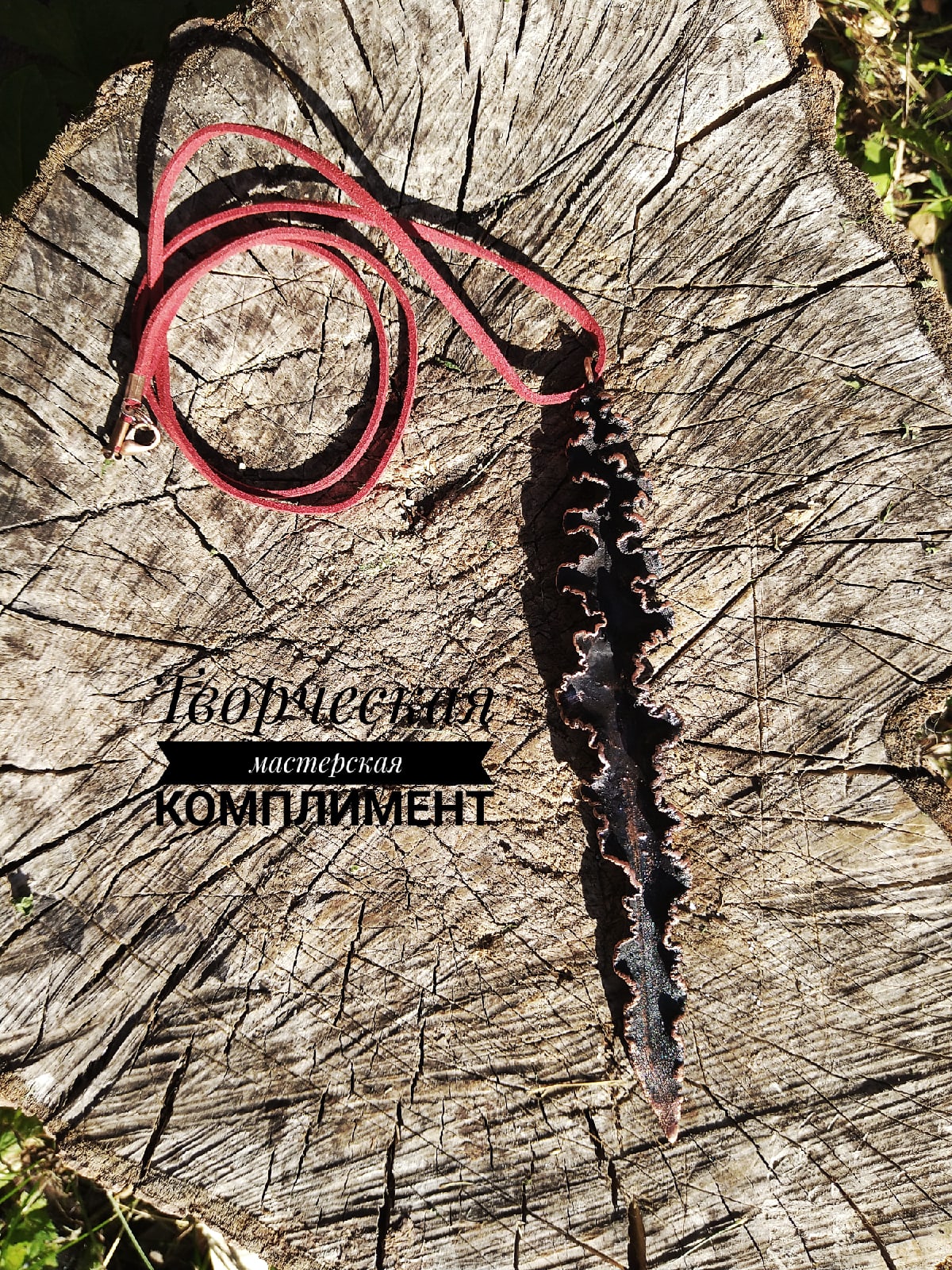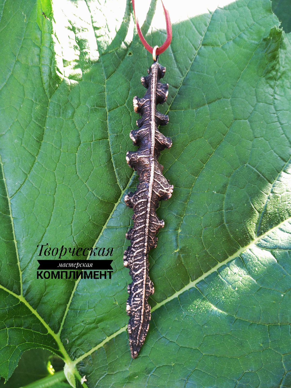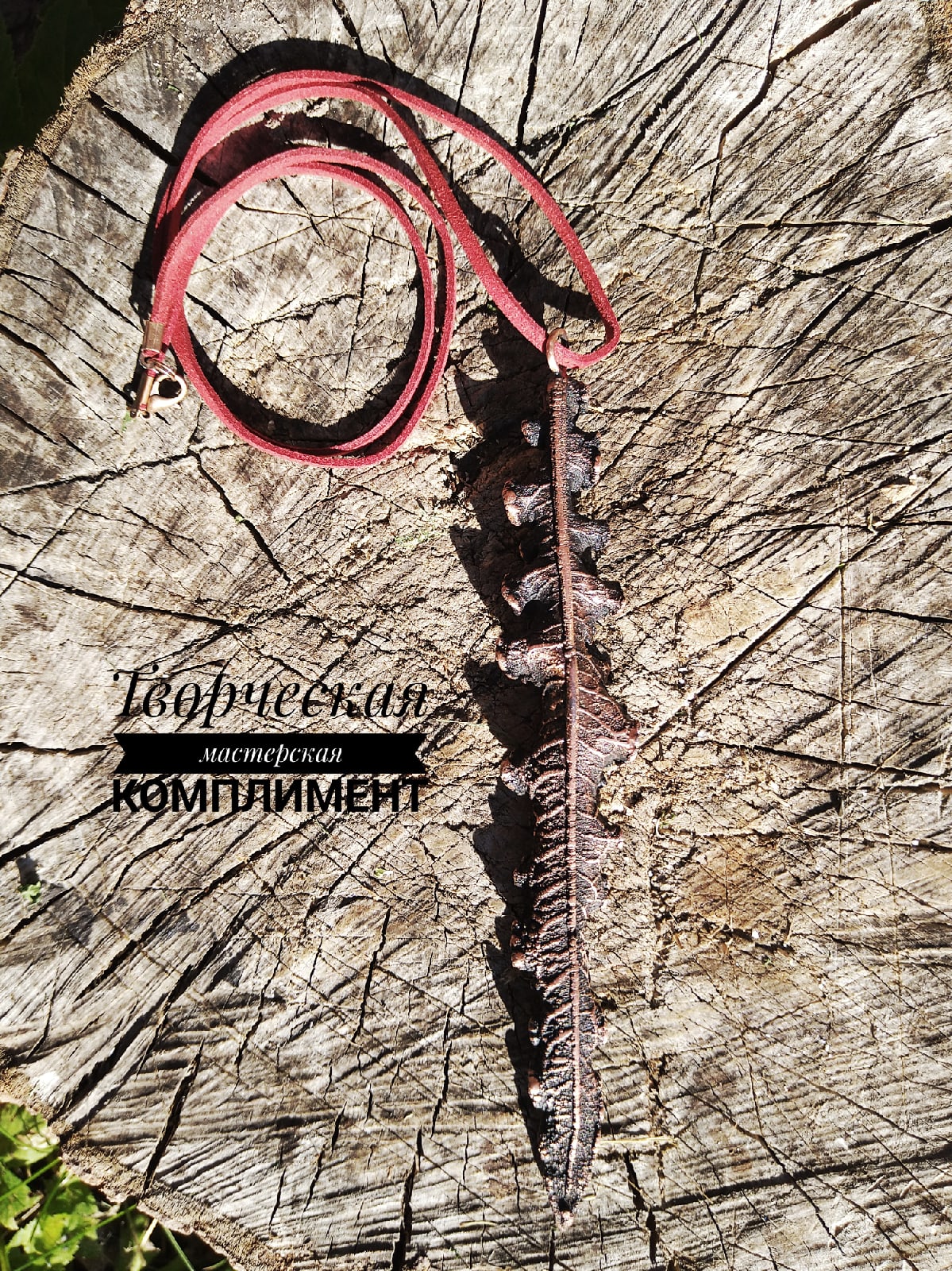 Кулон из листочка конского щавеля на кожаном шнурке, патина чернение, листочек около 16 см длинной.