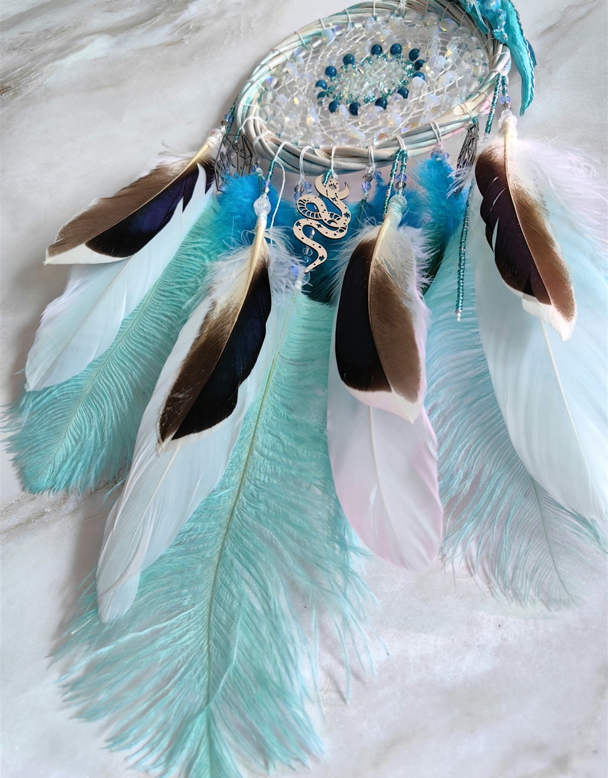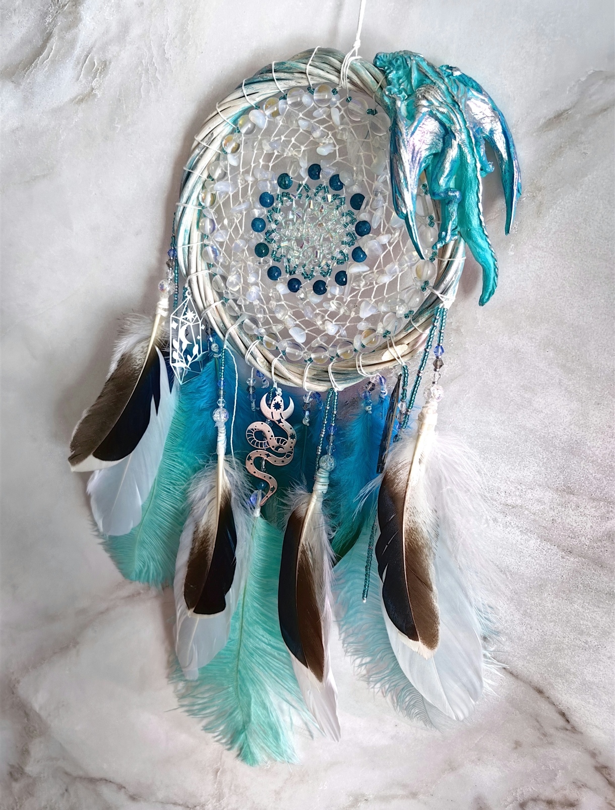 ✨Этот изысканный ловец снов, в котором слились воедино нежность бирюзы, магия лунного камня и мощь и суровость дракона. Этот оберег — не просто украшение, а целая симфония оттенков и символов, призванная оберегать ваши сны и наполнять их гармонией.