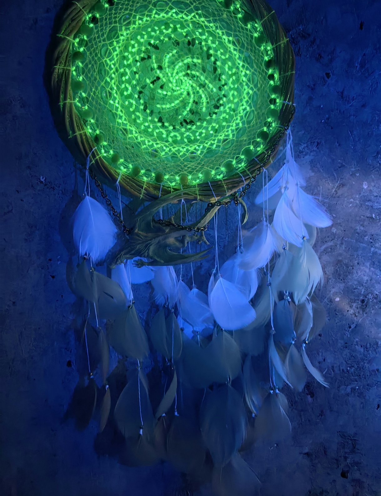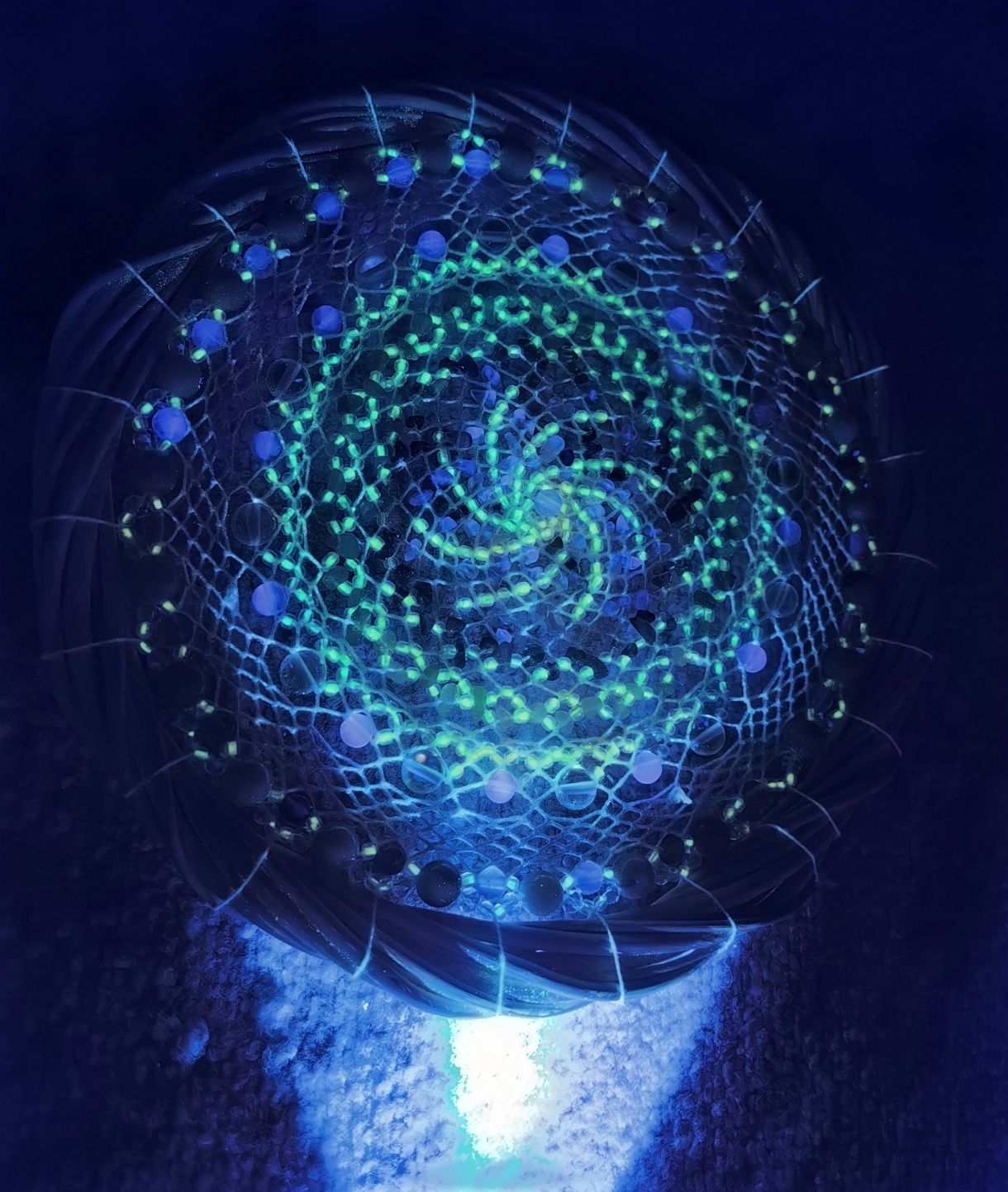 В работе использован светящийся в темноте бисер, каменные бусины флюорит. Бисер светится в темноте, часть камней при уф свете. На фото это конечно преувеличивает ночная съемка, светится он не так сильно)