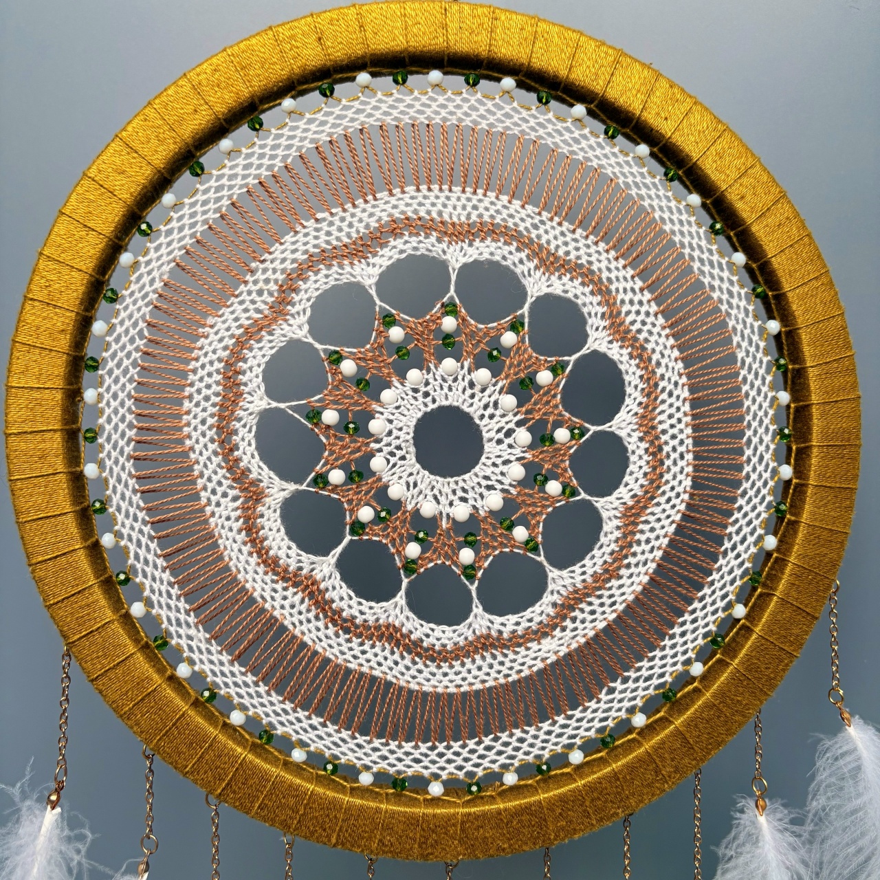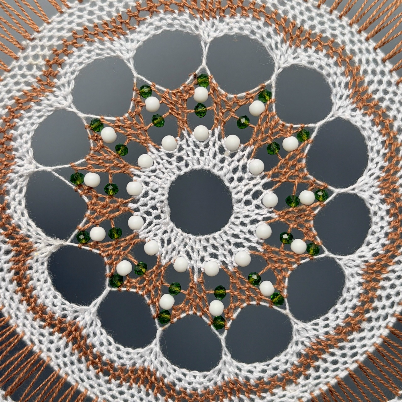 - Узор в центре. Изумрудные и белые бусины которые подчеркивают геометрию плетения.