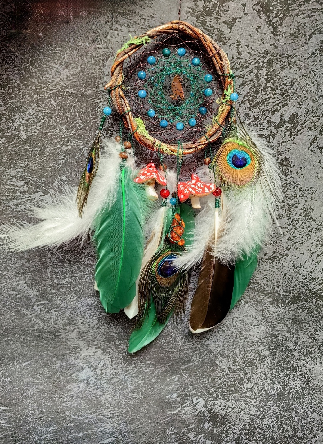 Этот ловец снов — словно кусочек волшебного леса, пойманный в круге древесных ветвей. Павлиньи перья, будто отблески закатного солнца, переливаются мириадами оттенков, а бирюзовые бусины создают ощущение прохладной реки, бегущей сквозь сны. Янтарная подвеска, словно капля солнечного света, хранит в себе тепло древних времён и оберегает от тревог. Красные грибы добавляют шарма и напоминают о сказочных тропинках. Этот амулет не просто украшение — он проводник в мир добрых грёз. Грибочки сделаны и покрашены в ручную из глины. Мох живой покрашен.