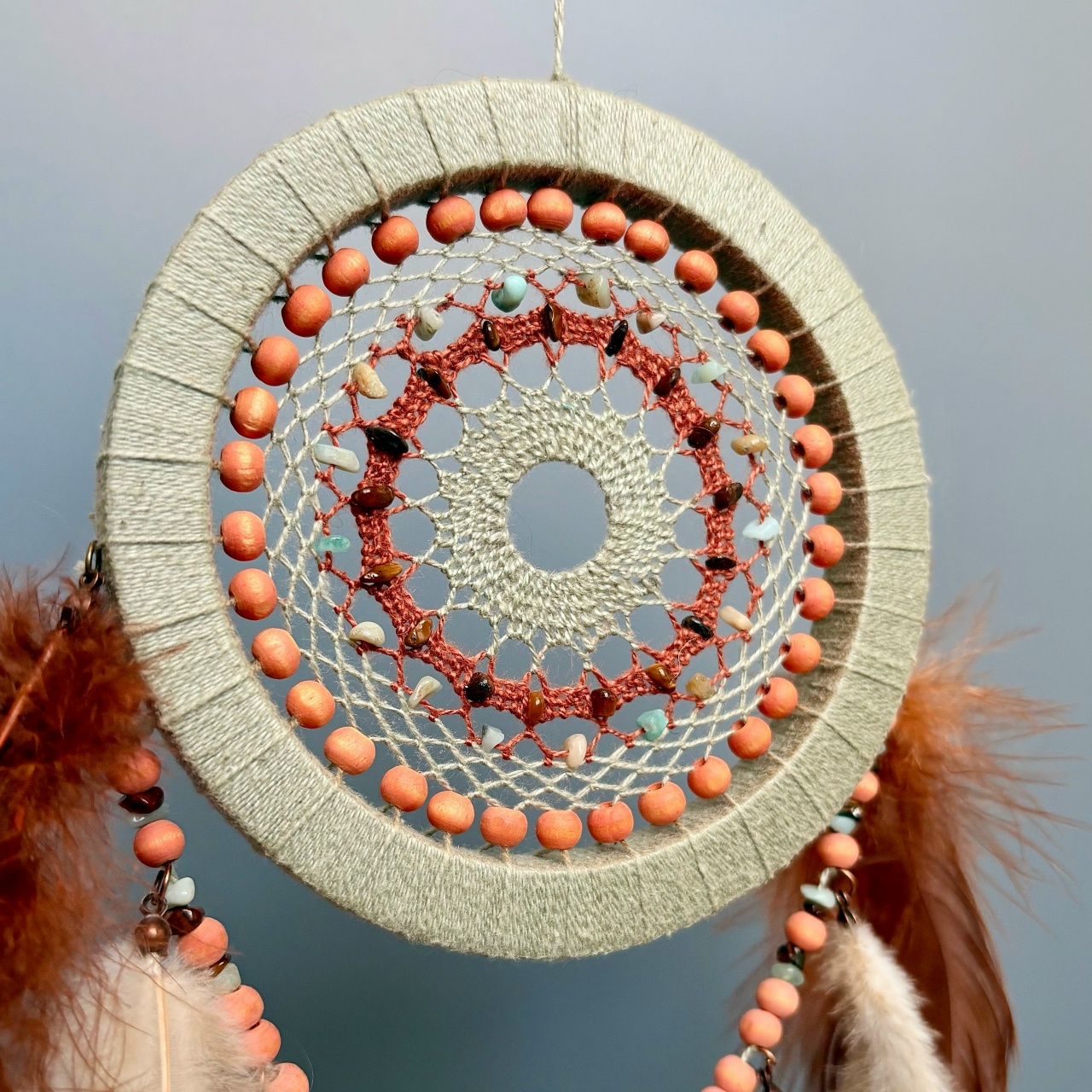 Плотная и прочная пластиковая основа, хлопковые нити, бусины из натурального дерева окрашенные пищевым красителем, бусины из каменной крошки тигрового глаза и амазонита, натуральные окрашенные перья петуха.
