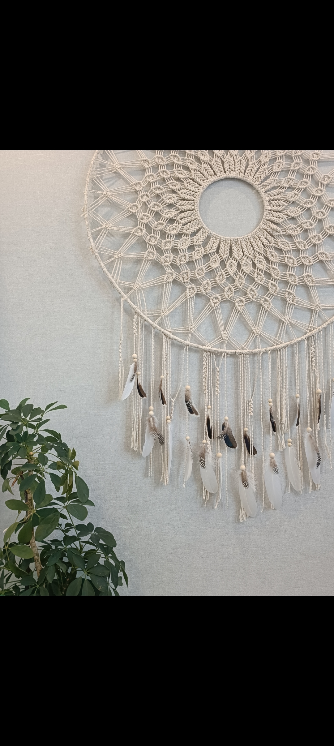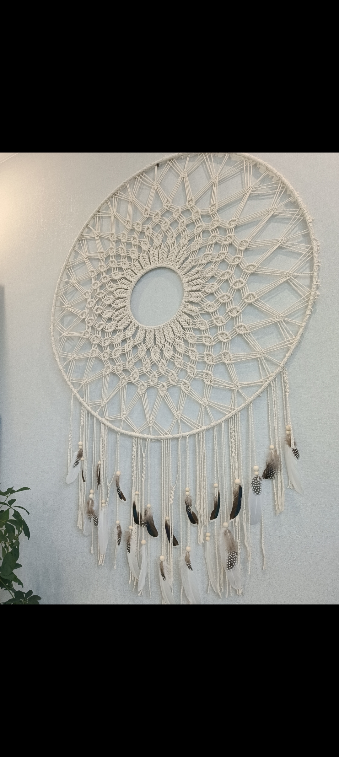 Ловец снов в технике макраме. Размер кольца 110см, длина с учетом бахромы и перьев 170см. Изготавливаю из натуральной хлопковой нити, кольцо из металлической проволоки, крашенное, с добавлением перьев и деревянных бусин.