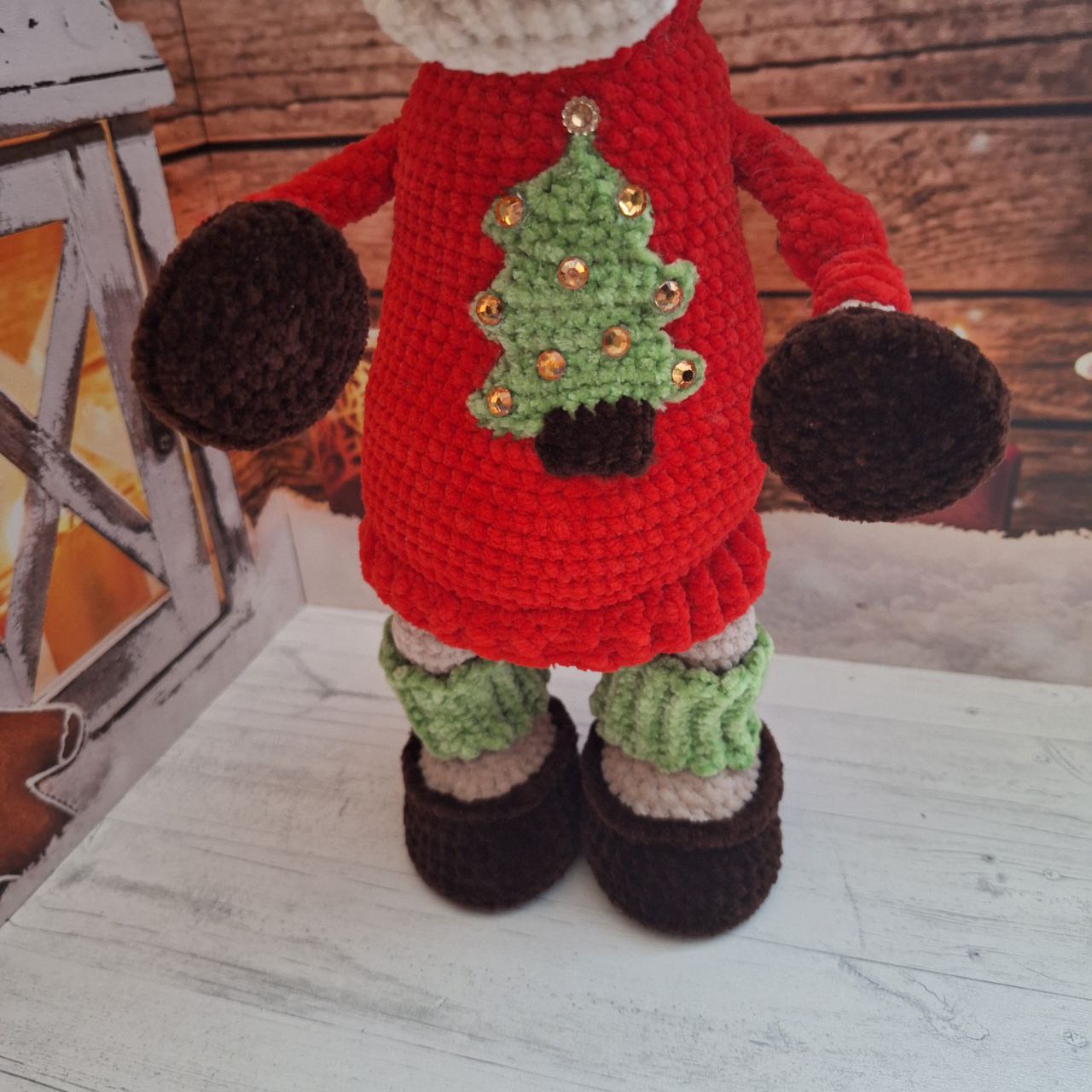 Единственная съемная деталь – его праздничная шапочка! Красная шапка с пушистым белым обрамлением добавит еще больше новогоднего настроения. А вот свитер и гетры – неотъемлемая часть его образа, они не снимаются.