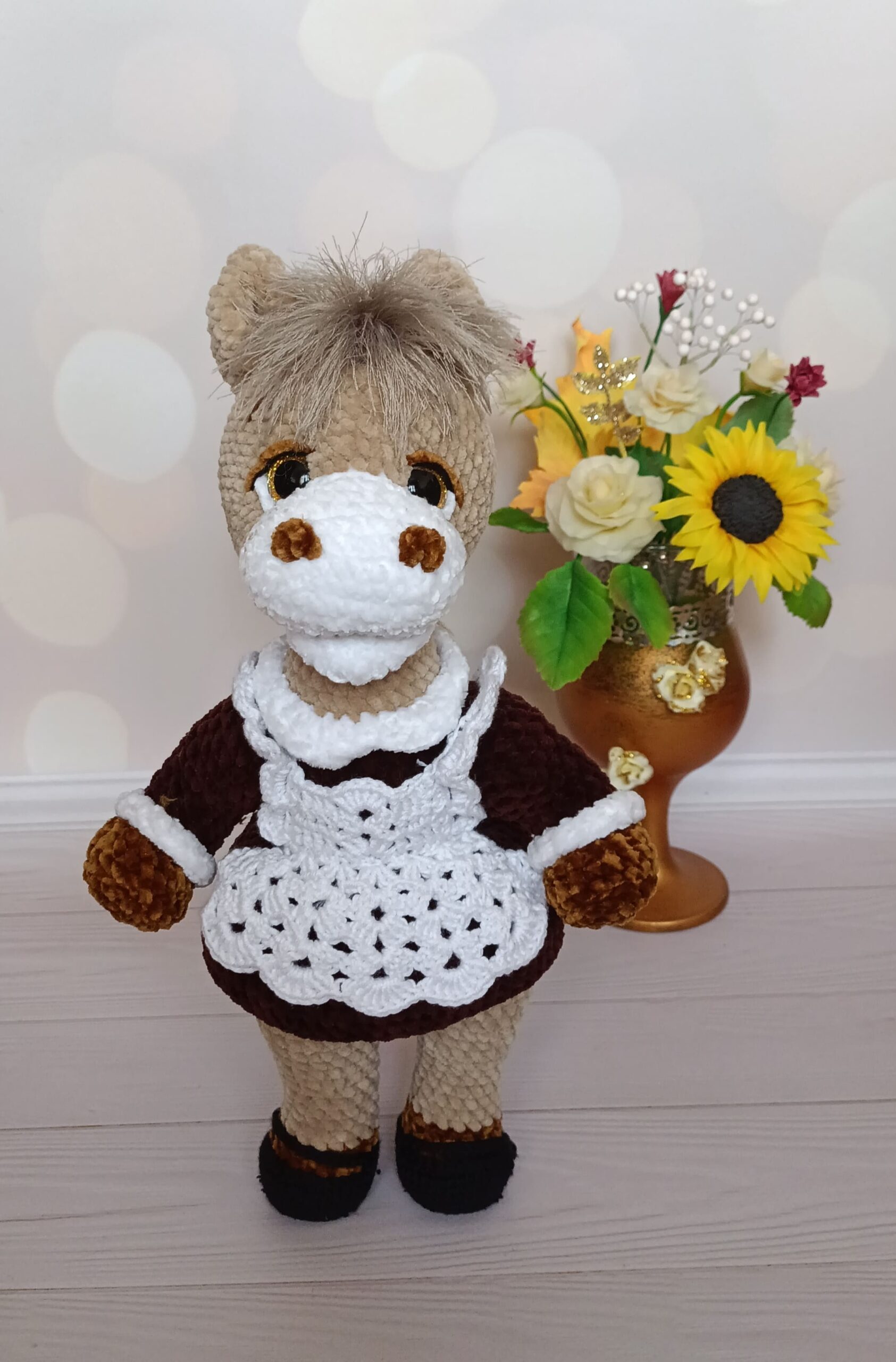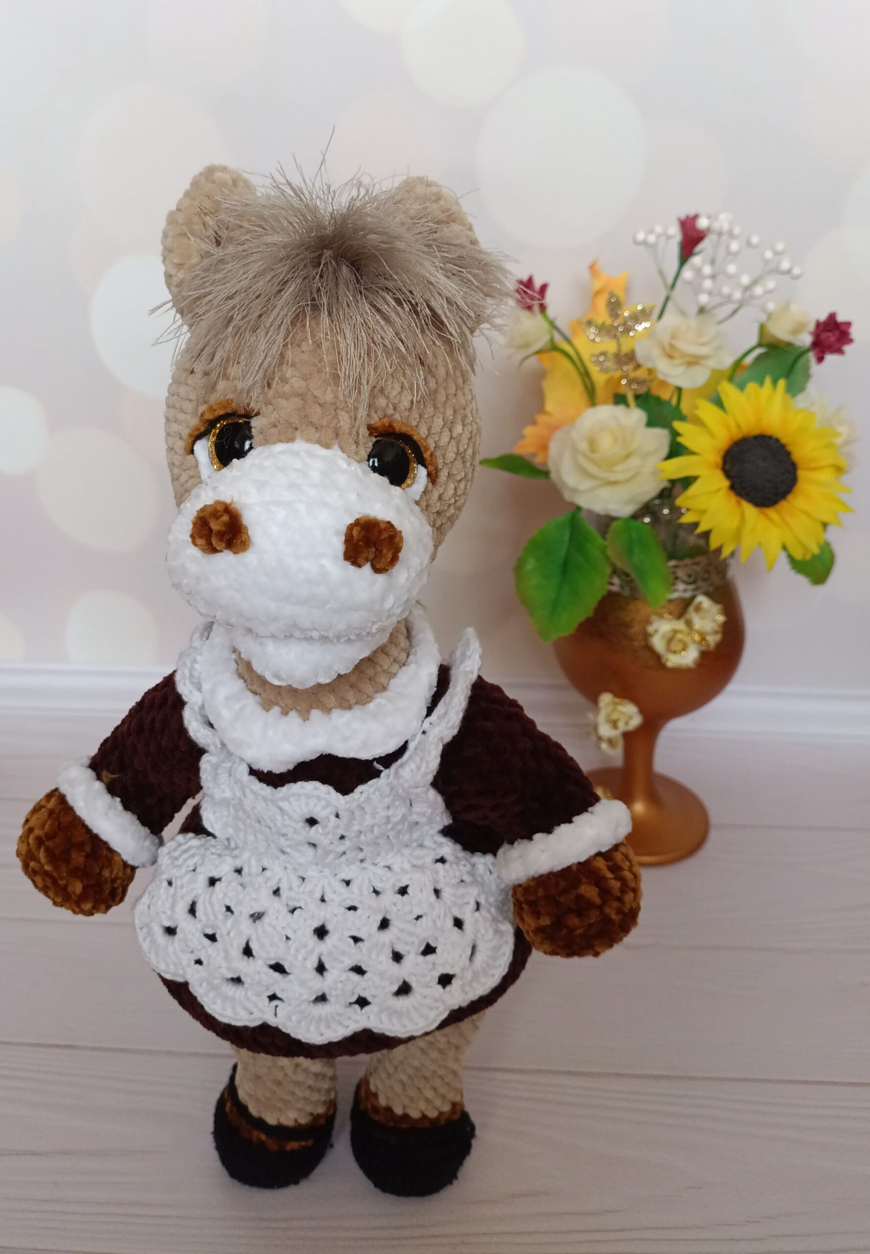 амигуруми лошадка в фартуке; лошадка крючком с нарядом;