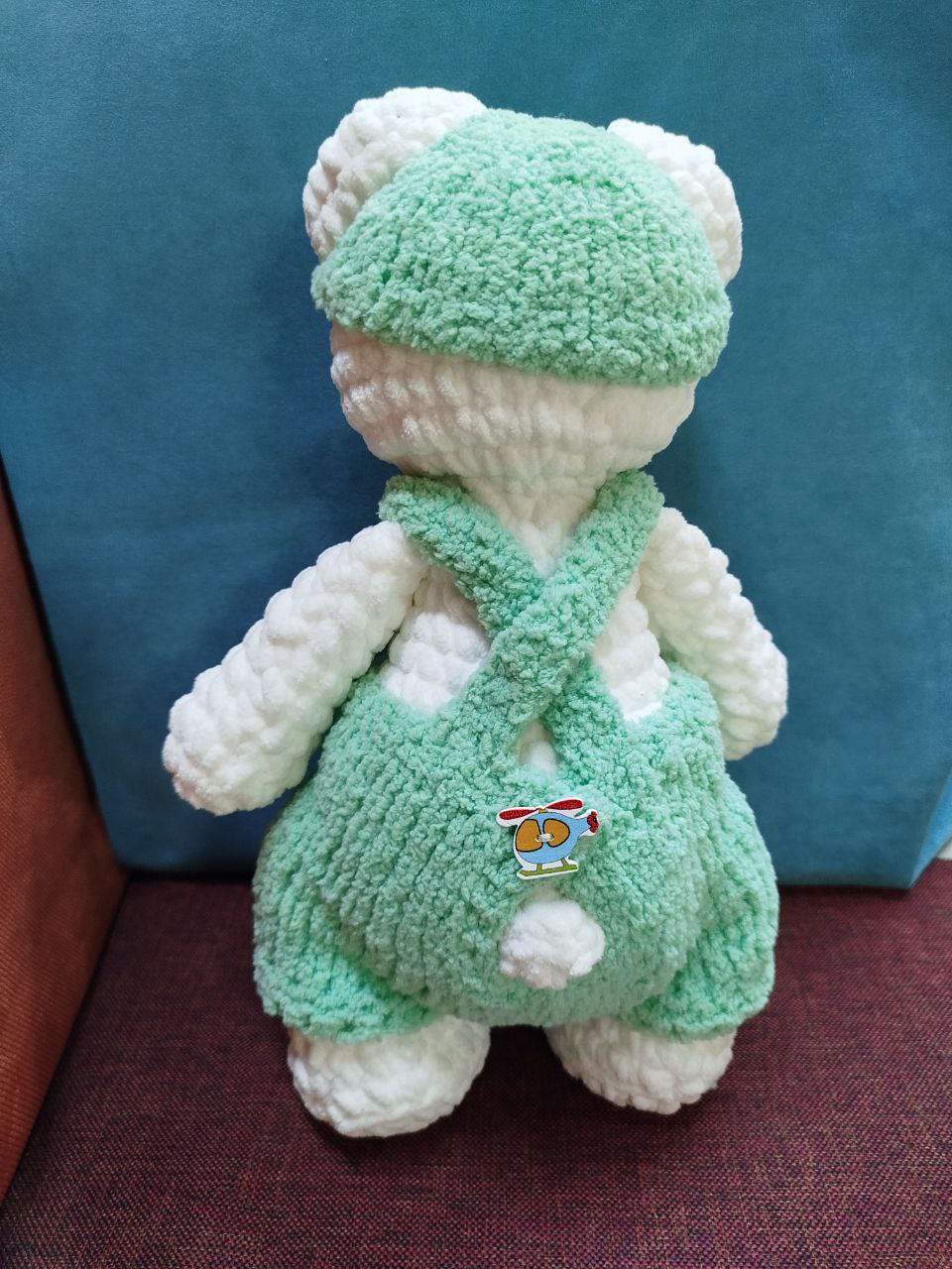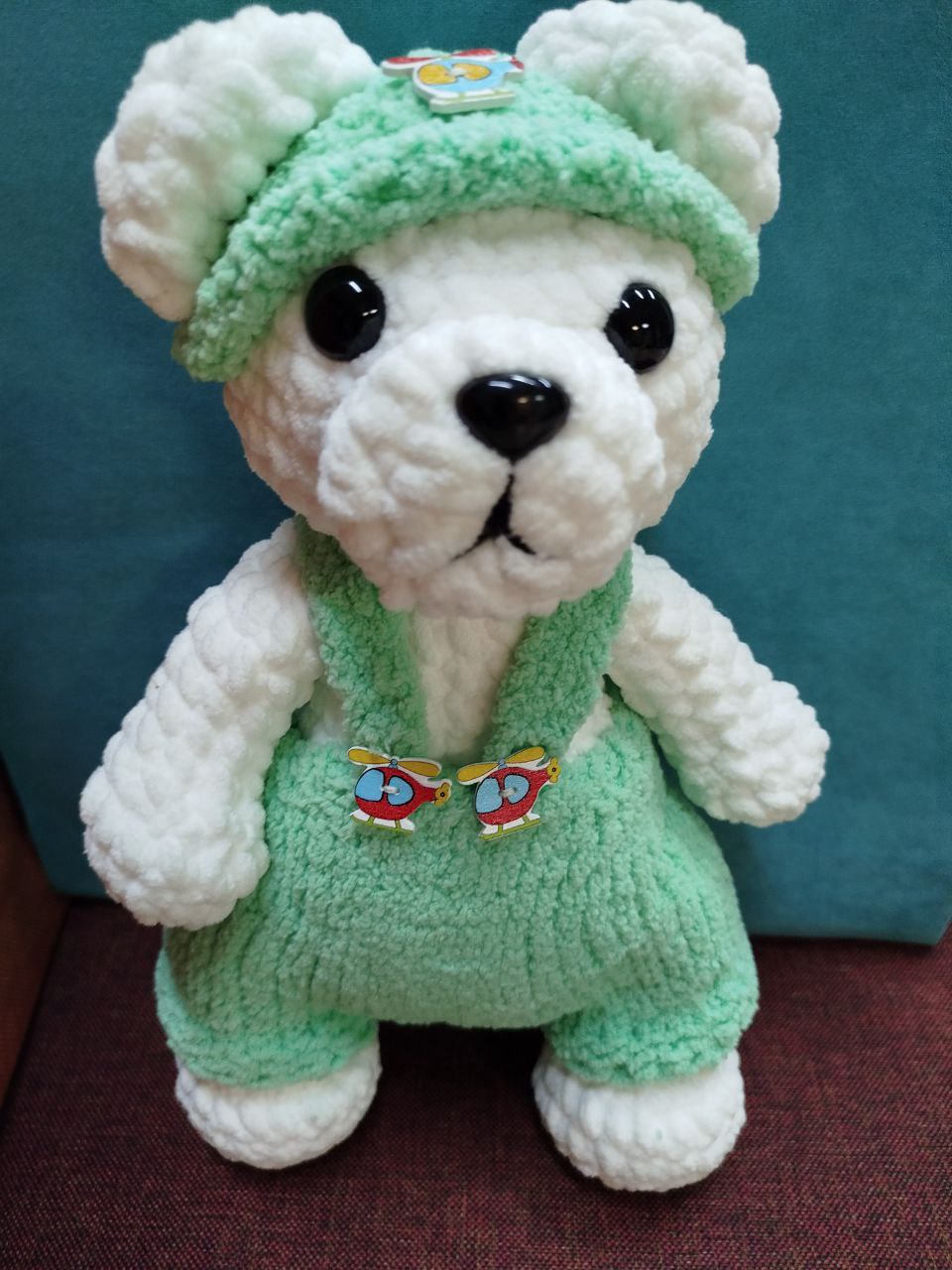 - Дизайн: мишка одет в уютный зелёный комбинезон и шапочку в тон, украшенные милыми декоративными элементами в виде вертолётиков.