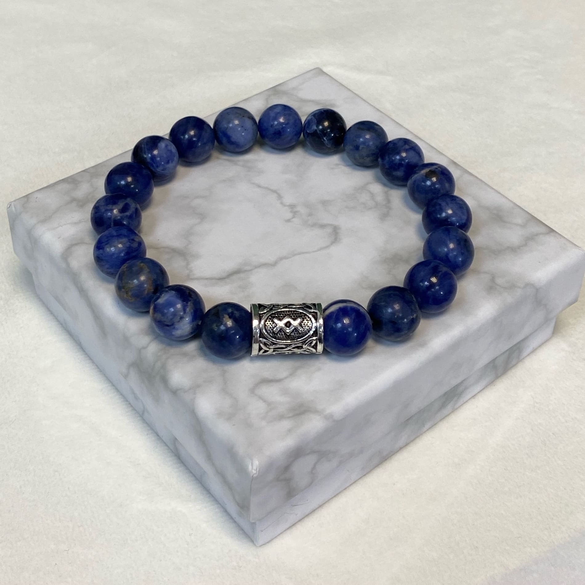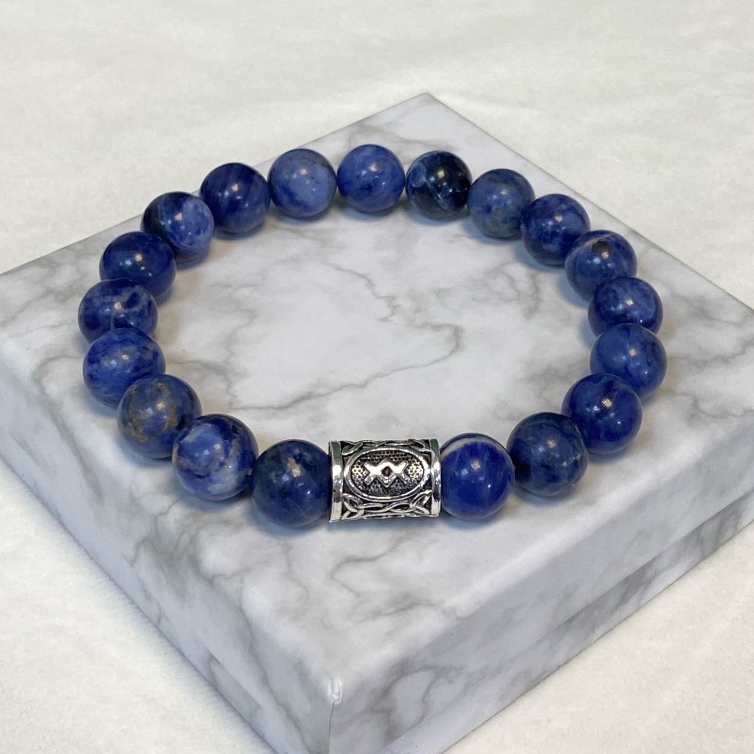 Мужской браслет из Содалита и руны Феху Бусины 10 мм Фурнитура бижутерный сплав Размер 17см -21см