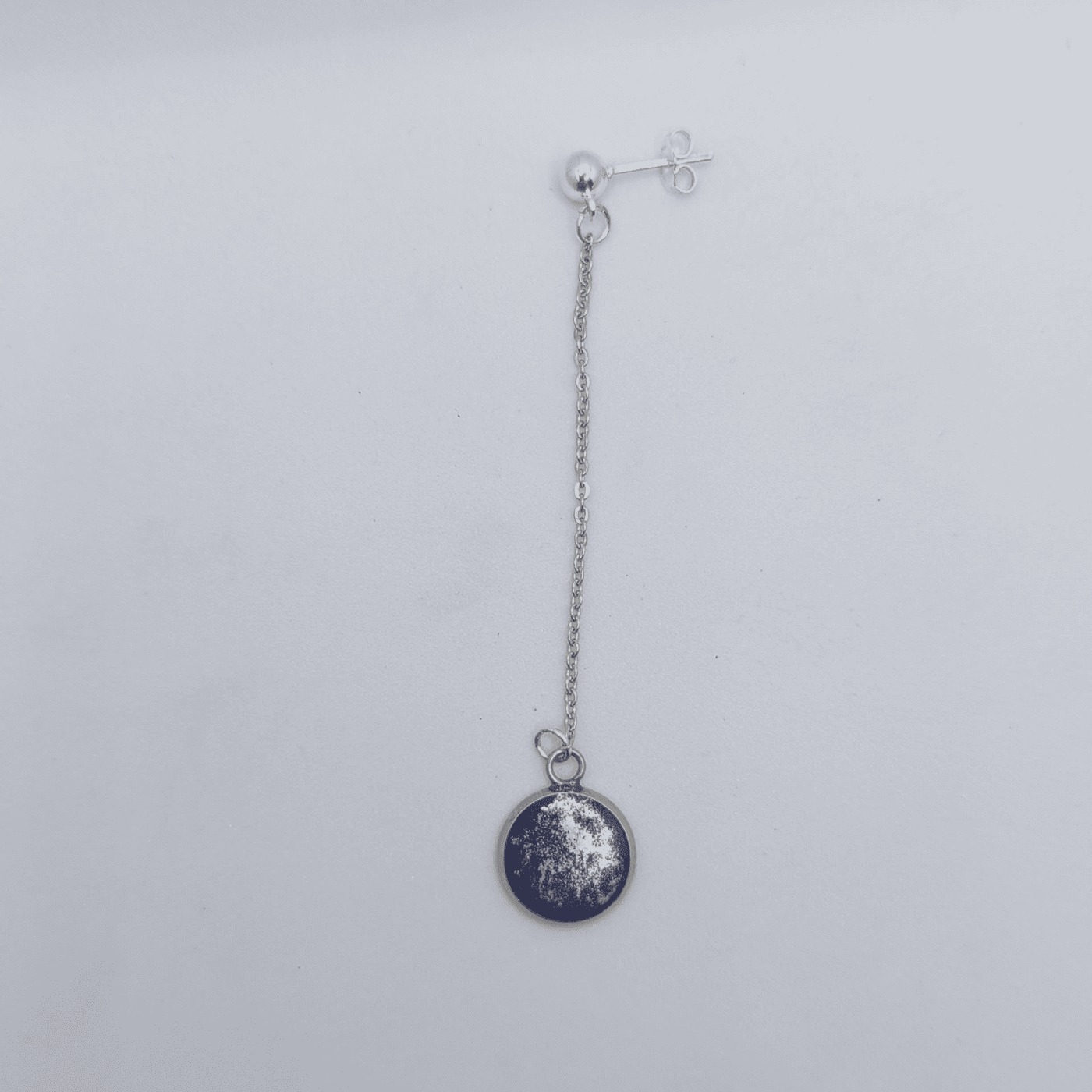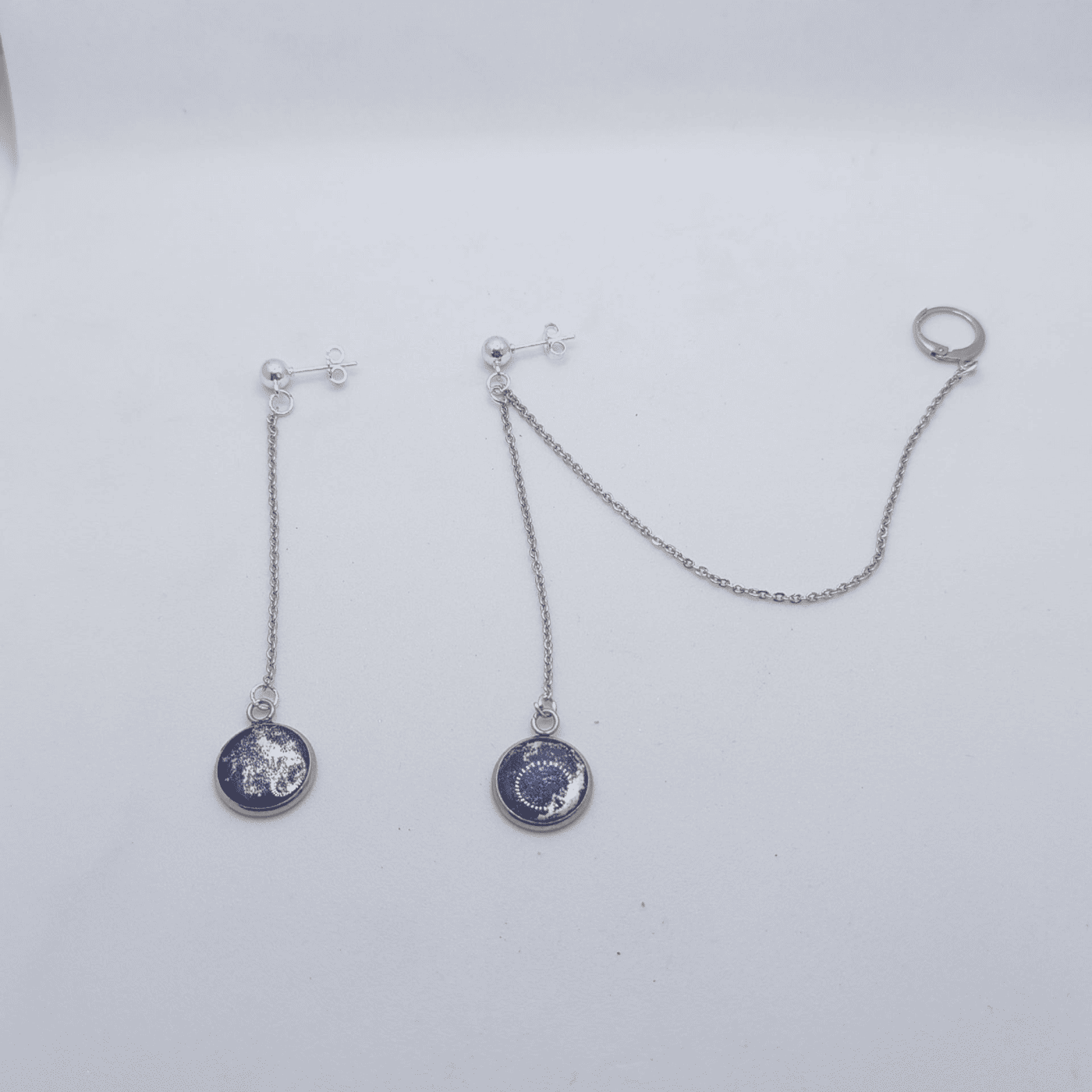 Серьги выполнены в лаконичном, но выразительном стиле. Каждая серьга представляет собой круглый диск с тем же тёмно-синим фоном и мерцающими деталями, что создаёт эффект миниатюрных лун. Лёгкая цепочка, соединяющая диск с основой, добавляет динамики и подчёркивает воздушность образа.