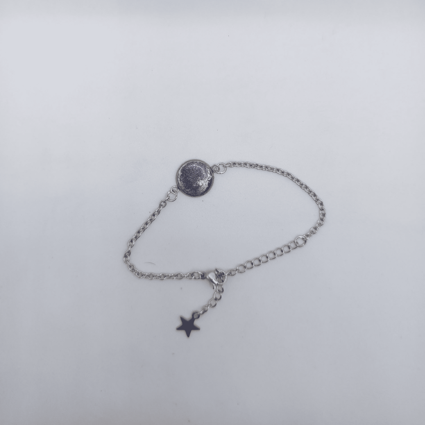 Браслет гармонично дополняет композицию. Он состоит из тонкой серебряной цепочки с центральным круглым элементом, повторяющими дизайн кулона — тёмно-синий «космос» с лунными бликами. Браслет словно хранит в себе отблески лунного света, оберегая владелицу от тёмных сил и наполняя её энергией ночи.