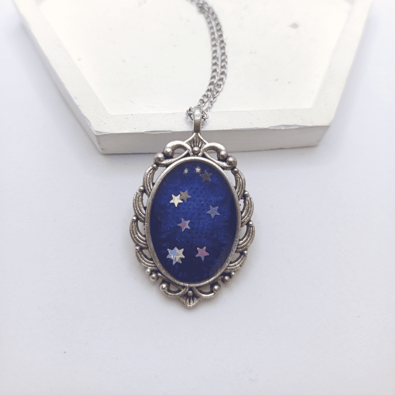 Кулон — центральный элемент набора. Он выполнен в виде овальной подвески с изысканной ажурной оправой, напоминающей древние эльфийские узоры. В центре кулона — глубокий тёмно-синий фон, имитирующий ночное небо, усыпанное серебряными звёздами. Этот мотив символизирует связь с космосом и тайными знаниями, которыми обладали жрицы лунной богини. Кулон подвешен на изящной цепочке цвета серебра.