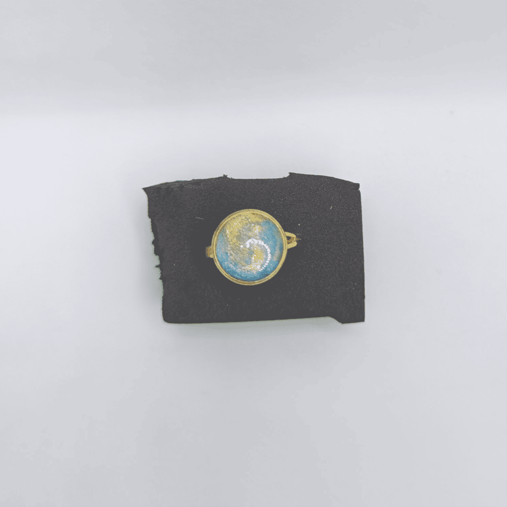 Кольцо выполнено в минималистичном, но выразительном стиле: круглый камень с изображением небесно-голубого неба и золотого отблеска солнца заключённых в тонкую золотистую оправу. Этот мотив олицетворяет бесконечность летнего неба и связь с высшими силами. Кольцо словно хранит в себе кусочек ясного дня, принося удачу и наполняя энергией.