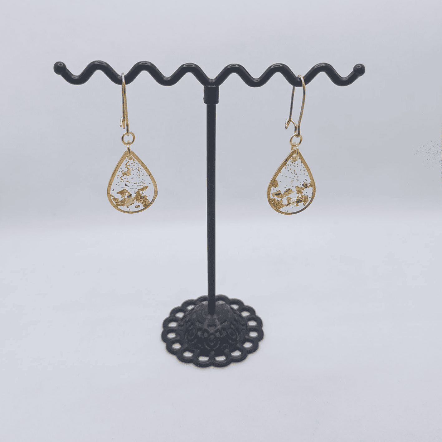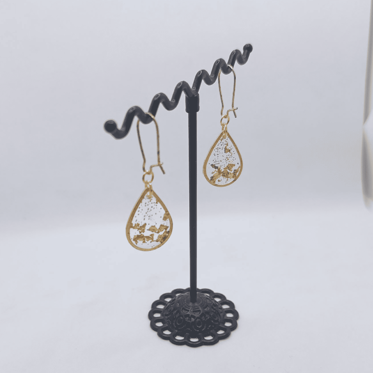 Серьги выполнены в форме изящных капелек, обрамлённых золотистой оправой. Внутри каждой серьги — полупрозрачная смола с вкраплениями золотой потали, напоминающими солнечные блики на воде. Они словно улавливают и хранят частицу солнечного света, переливаясь при каждом движении. Эти серьги символизируют лучи солнца, мягко касающиеся щёк, и придают образу лёгкость и сияние.