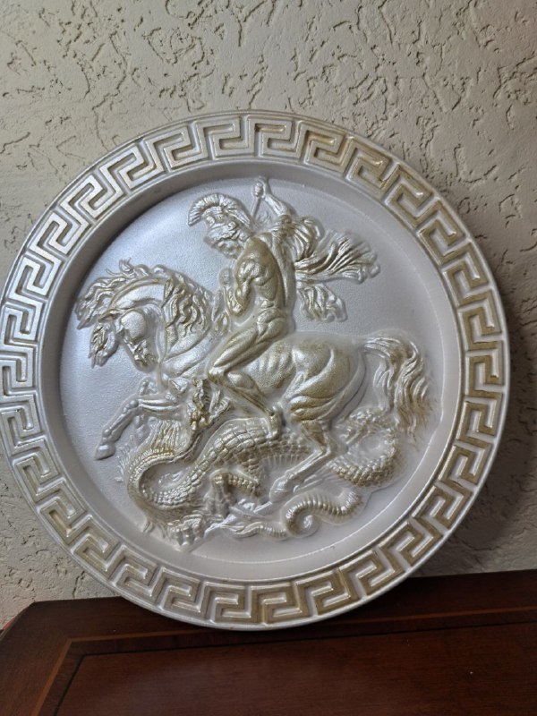 Интерьерное панно из гипса «Георгий Победоносец» — выразительный декоративный элемент с глубоким символическим смыслом. Объёмный рельеф и детальная проработка образа делают панно эффектным акцентом в интерьере дома, кабинета или рабочего пространства.