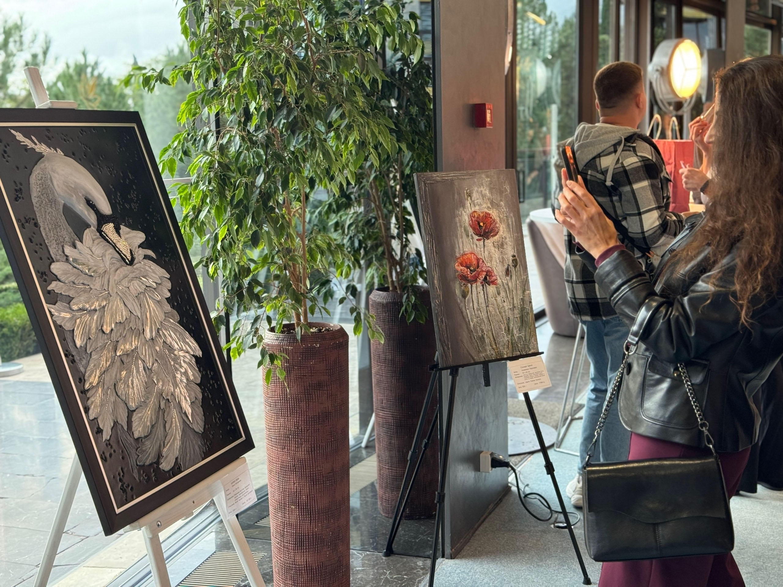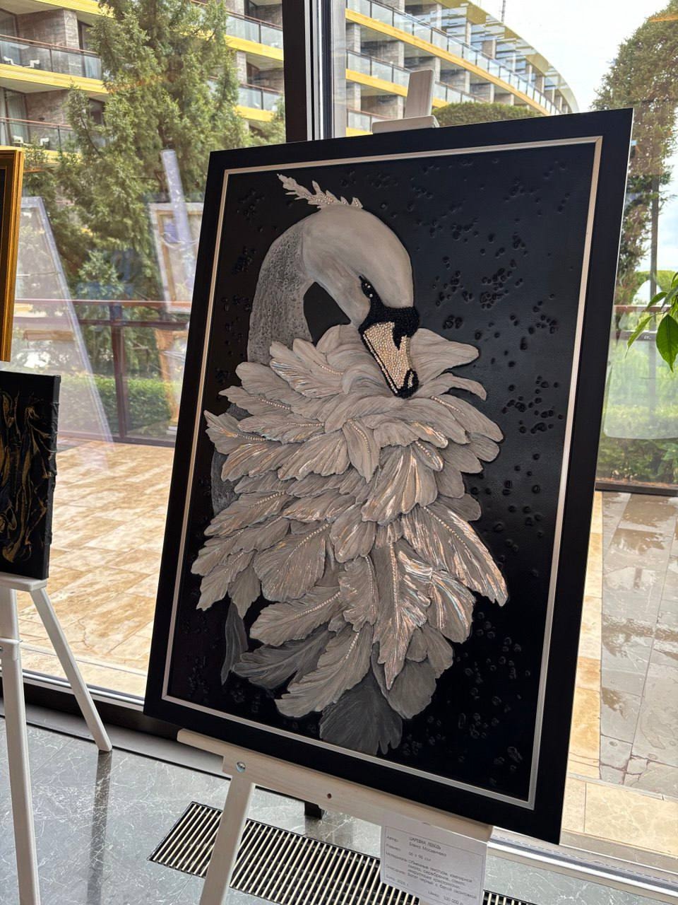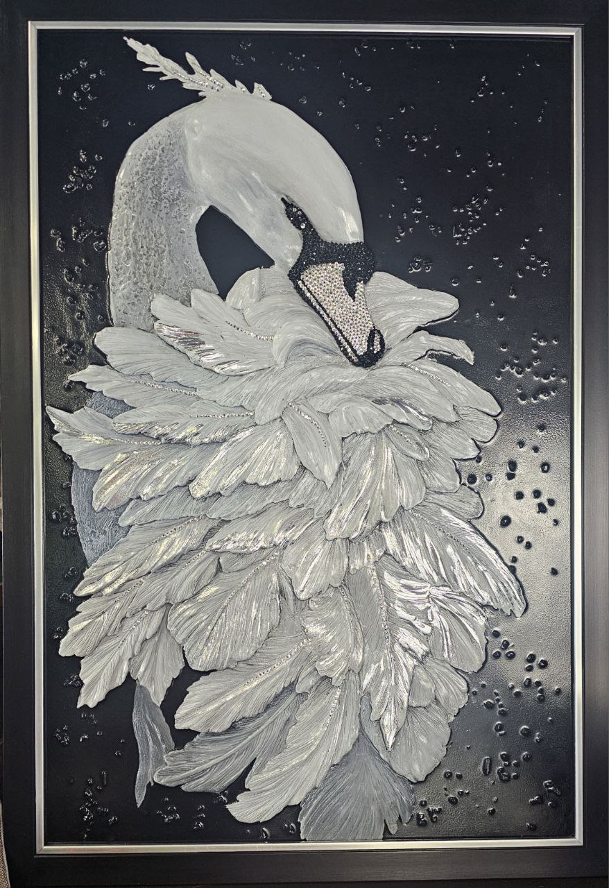 На панно изображён лебедь, выполненный в технике объёмной живописи. Перья прорезаны вручную. Инкрустация кристаллами, серебрение.