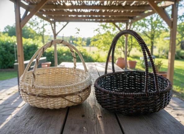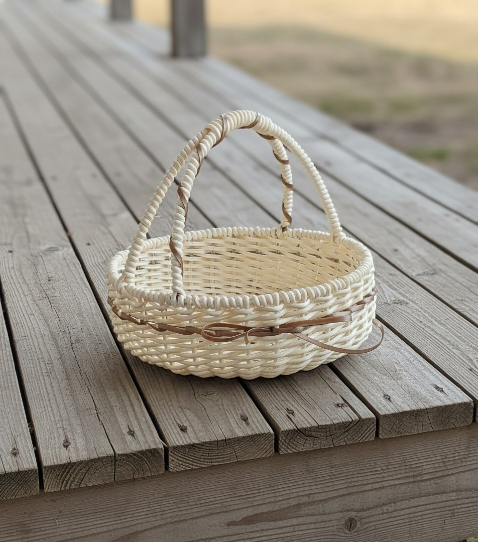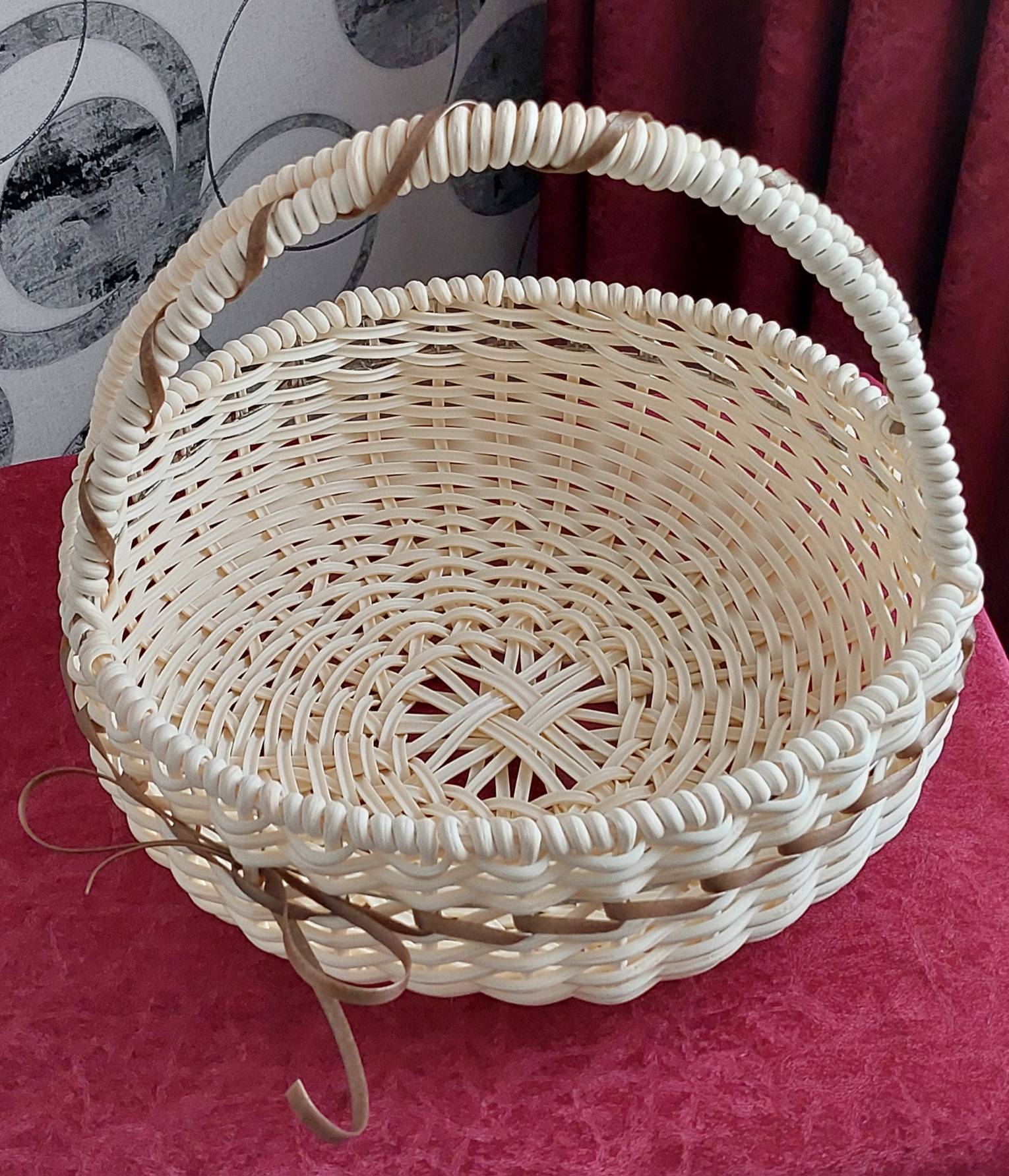Выполнена из полиротанга с-профиля (полутрубки) с использованием кольца из нержавеющей оцинкованной сетки. Корзина прочная, отлично держит форму, дно не проминается под тяжестью. Ручка сдвоенная, не деформируется при нагрузке, оплетена в цвет изделия. В основе ручки нержавеющий пруток, который придаёт ей крепость.