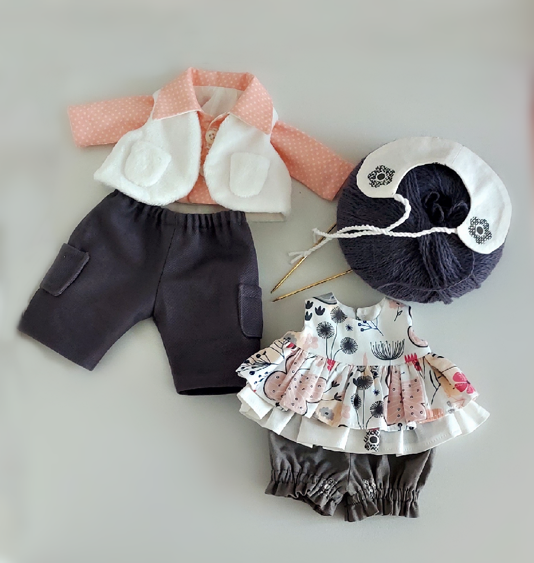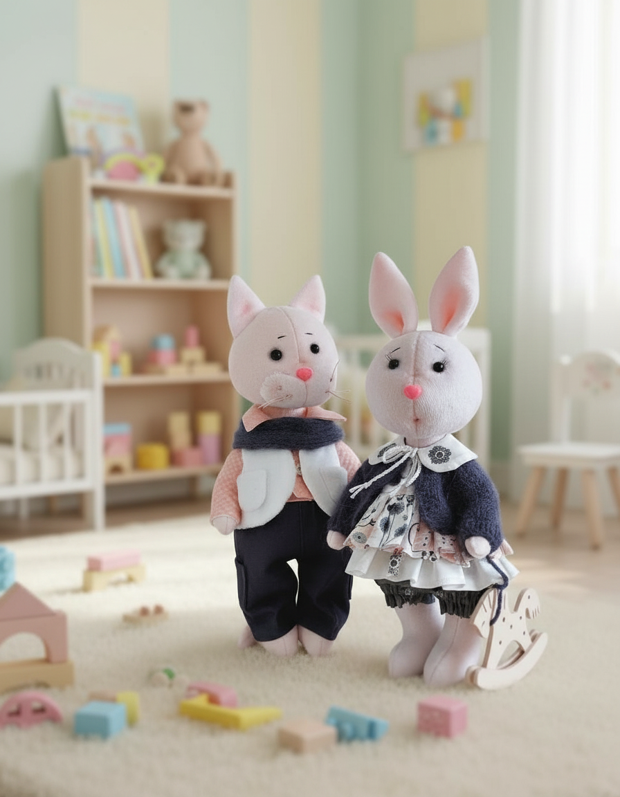 Обе игрушки выполнены из качественных, гипоаллергенных материалов. Тело игрушек выполнено из плюшевой ткани, одежда-хлопковые ткани, кофточка и шарфик-пряжа пух норки.