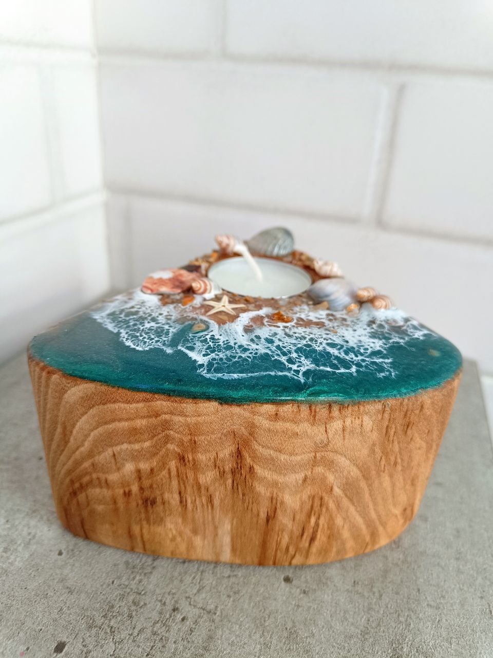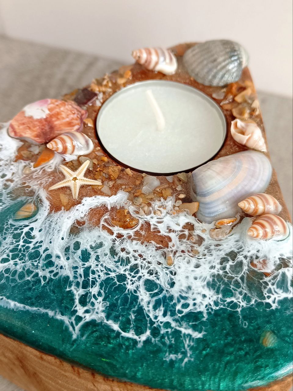 Дизайн: композиция, имитирующая морской берег — плавные переливы оттенков смолы воссоздают образ прибрежной волны, а деревянная основа придаёт изделию природную теплоту и фактурность.