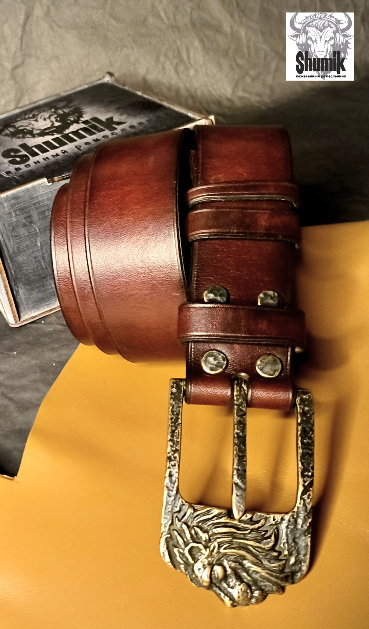 Пряжка: литая латунная пряжка с изображением льва, которая придаёт ремню особый шарм.