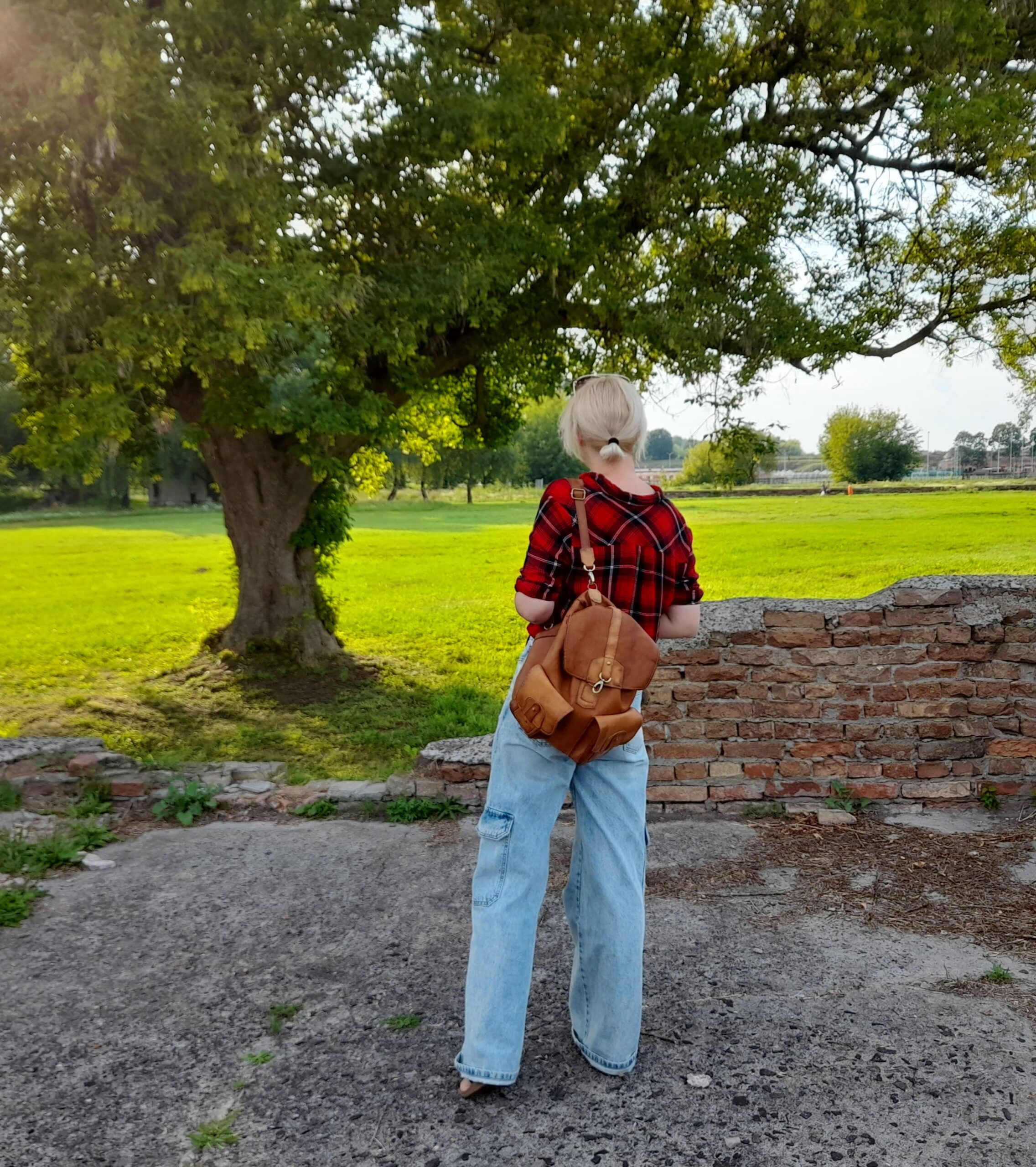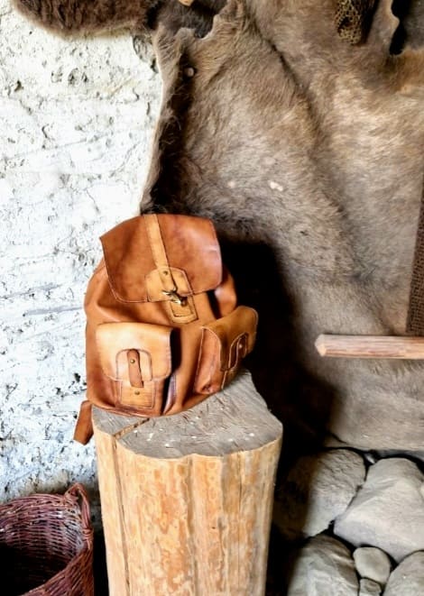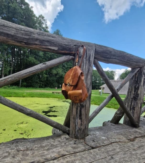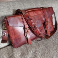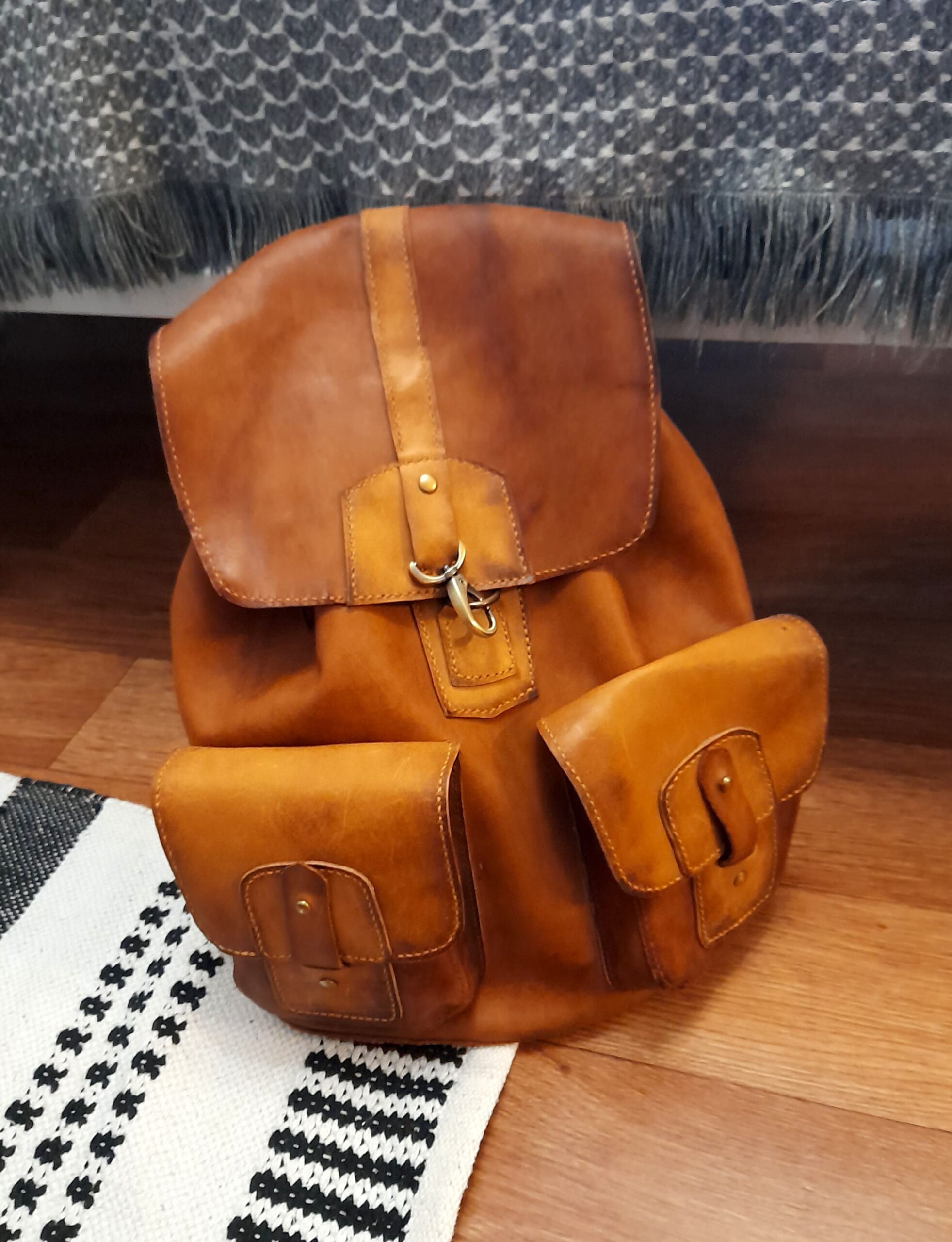 Изготовлен из кожи КРС высшего сорта, обработанной методом растительного дубления. Затонирован воском вручную. Одно большое отделение, затягивается кожаным шнуром и застегивается на карабин. Имеется 2 накладных кармана на кобурных кнопках. В них свободно помещаются вещи,которые должны быть под рукой-паспорт и телефон. Плечевые ремни особо прочные, прошиты вощеной нитью, съёмные, крепятся на карабины, длина 80 см.