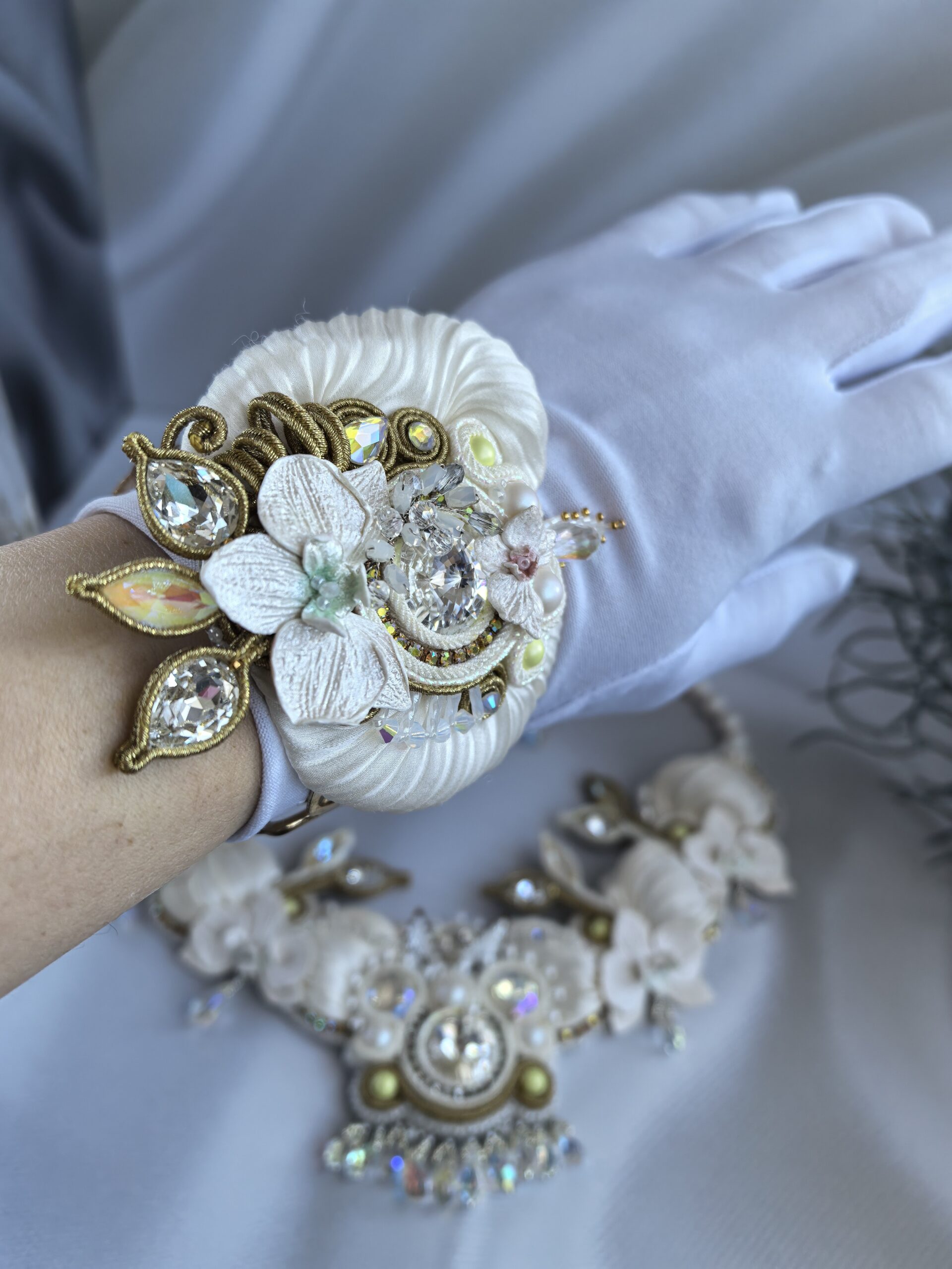 продуманное сочетание разных текстур (ткань, жемчуг, кристаллы);
