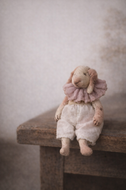 В одном уютном уголке волшебного мира, где каждая игрушка оживает с заходом солнца, жила-была крошечная зайка по имени Бусинка. Она была особенной — не только из-за своего нежного рюша на шее и очаровательных штанишек, но и потому, что обладала удивительным даром: Бусинка умела слушать мечты. Стоило кому-то прошептать ей свою заветную мечту, как зайка тут же отправлялась в волшебное путешествие, чтобы помочь мечте сбыться.