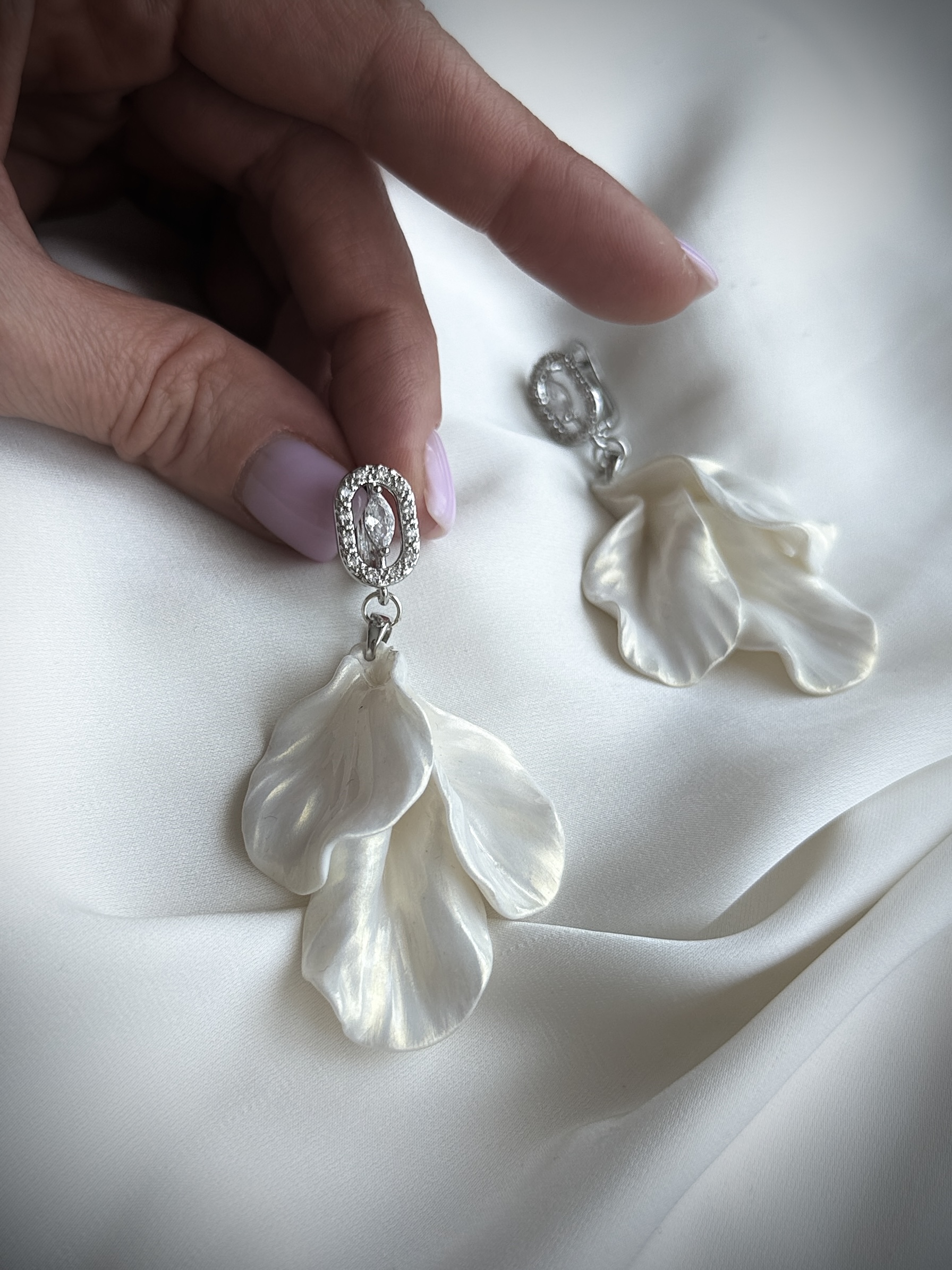 Серьги выполнены в технике ручной лепки из полимерной глины и покрыты перламутровой краской. Использована корейская фурнитура с родиевым покрытием, инкрустированная мелкими стразами.