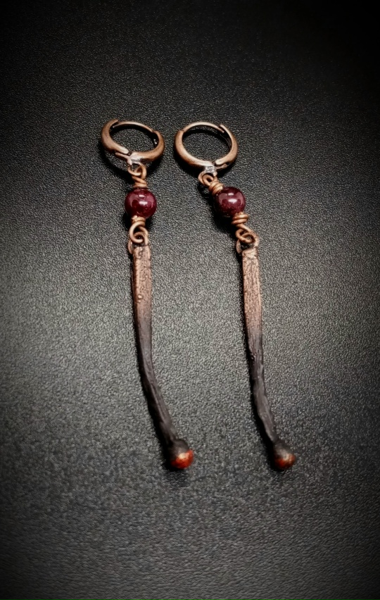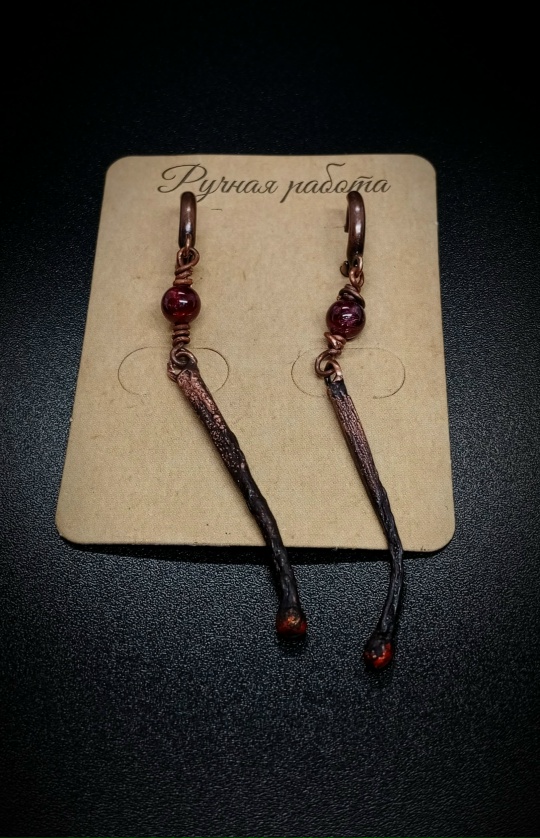 Серьги сделаны из настоящих спичек,которые сгорели,путем гальванопластики.