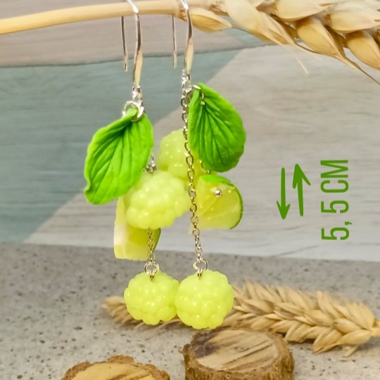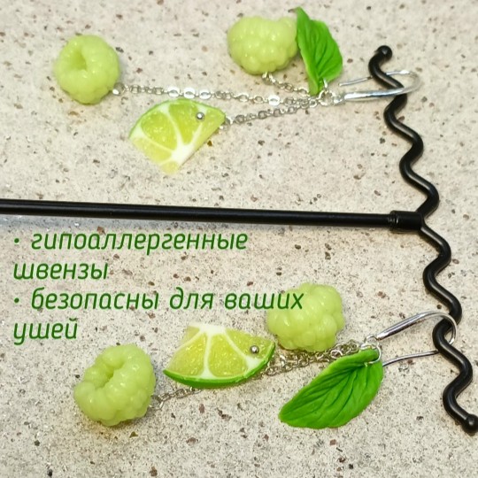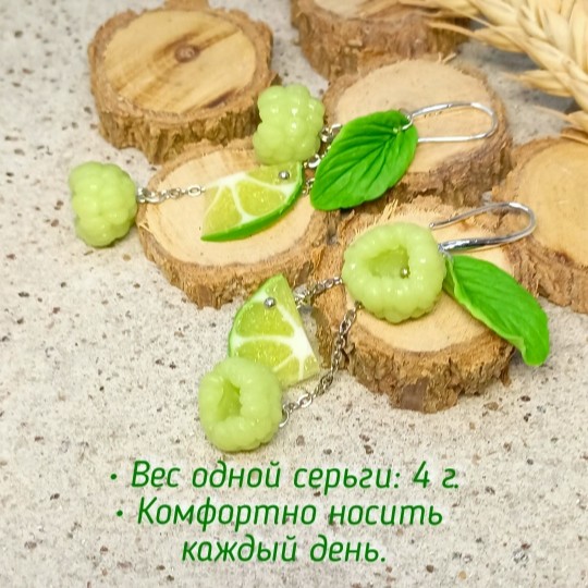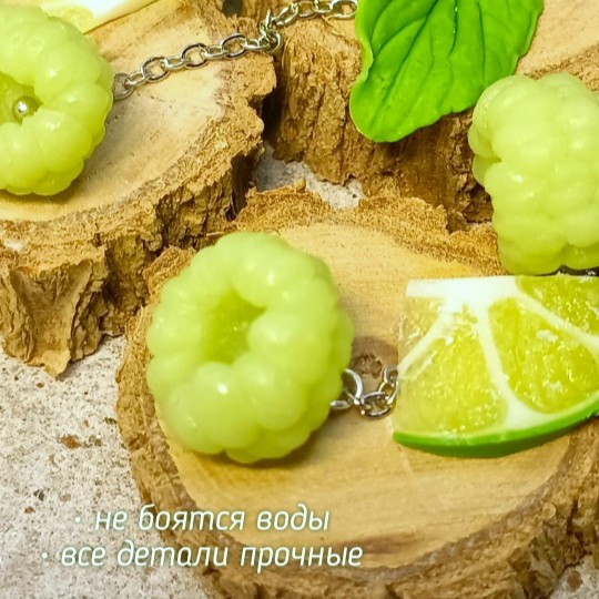 Возможен заказ фантазийных серёжек с лаймовой малиной и с кусочками лайма (см. карусель). А также изготовление под заказ подвески или браслета с малиной в комплект к серёжкам.