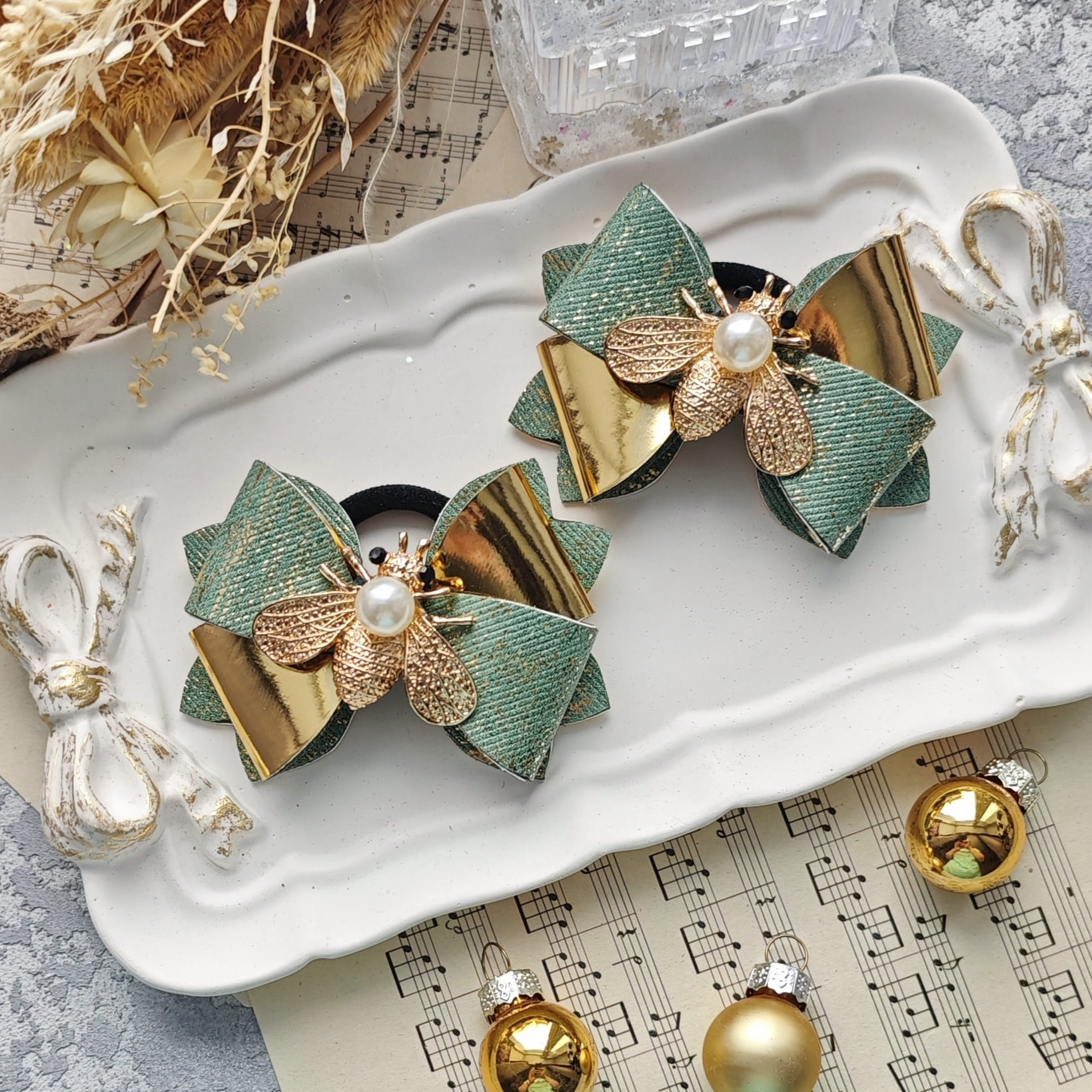 Изящные бантики, выполненные из двухстороннего материала: одна сторона — блестящий лак, вторая — фактурный «джинс». Украшены эффектной ювелирной мухой с жемчужиной, которая придаёт аксессуару нотку роскоши и оригинальности.