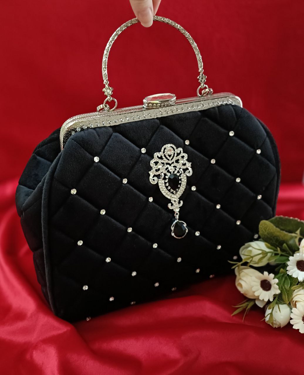 Сумочка изготовлена из велюра, расшита сверкающими стразами. В центре изысканная подвеска, достойная королевской особы.