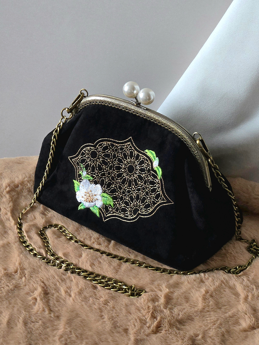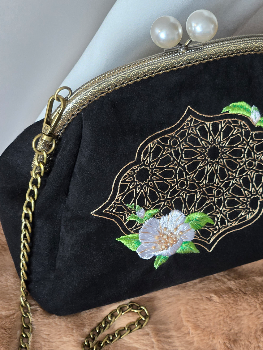 Сумка Марокко с жемчужным цветком из черной экозамши на фермуаре с вышивкой