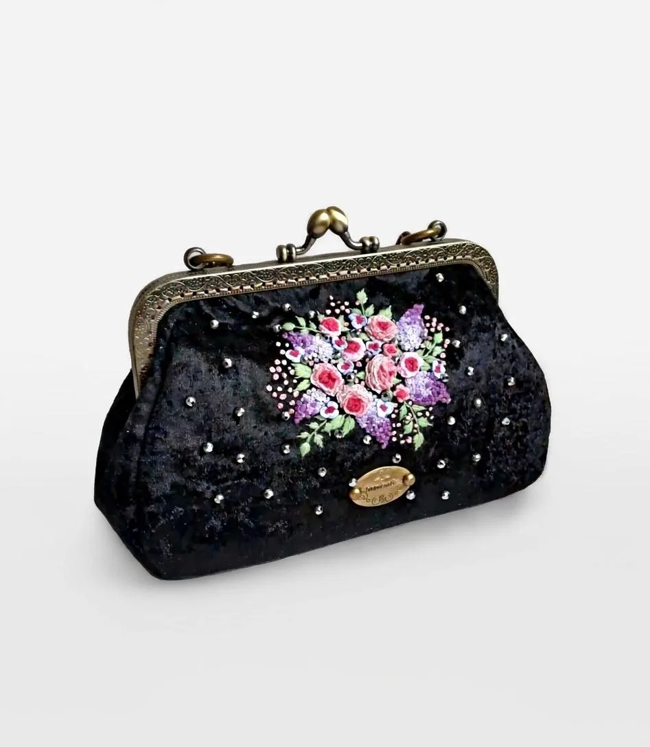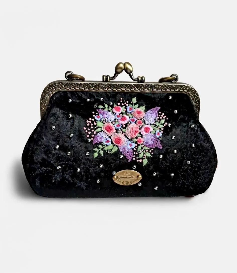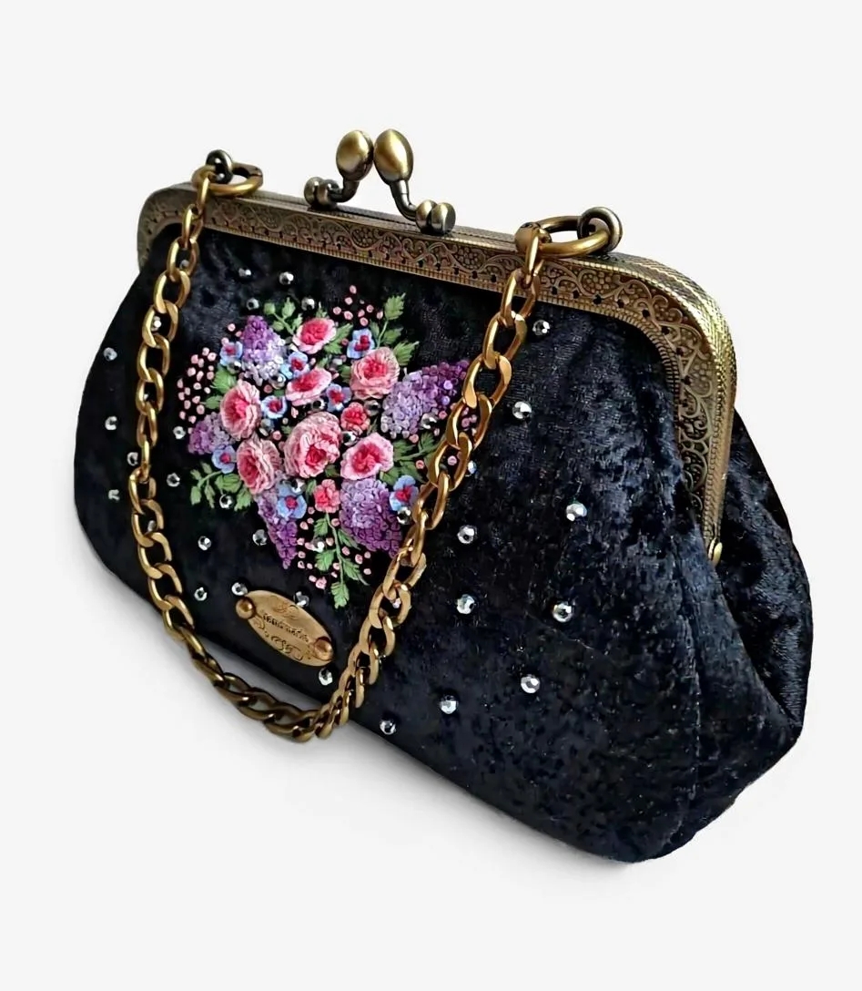 Сумка выполнена из мраморного бархата, декорирована вышивкой мулине в бразильской технике, хрустальными бусинами.