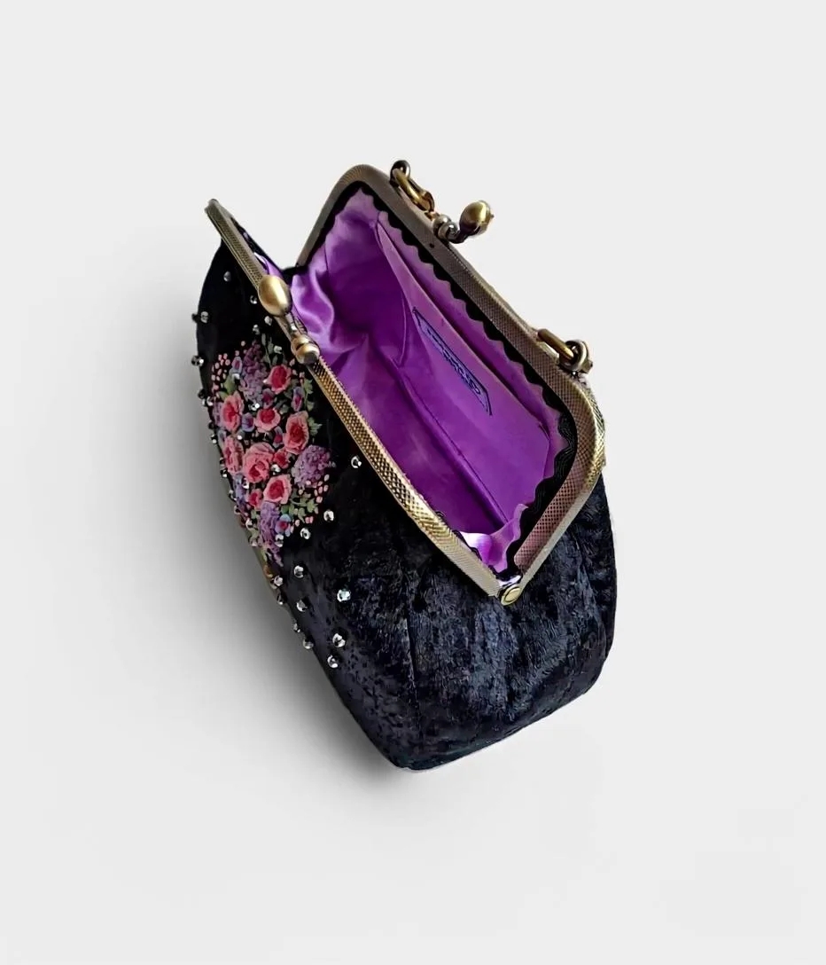Сумочка укреплена специальным сумочным уплотнителем, внутри подкладка в тон вышивки, есть открытый кармашек.